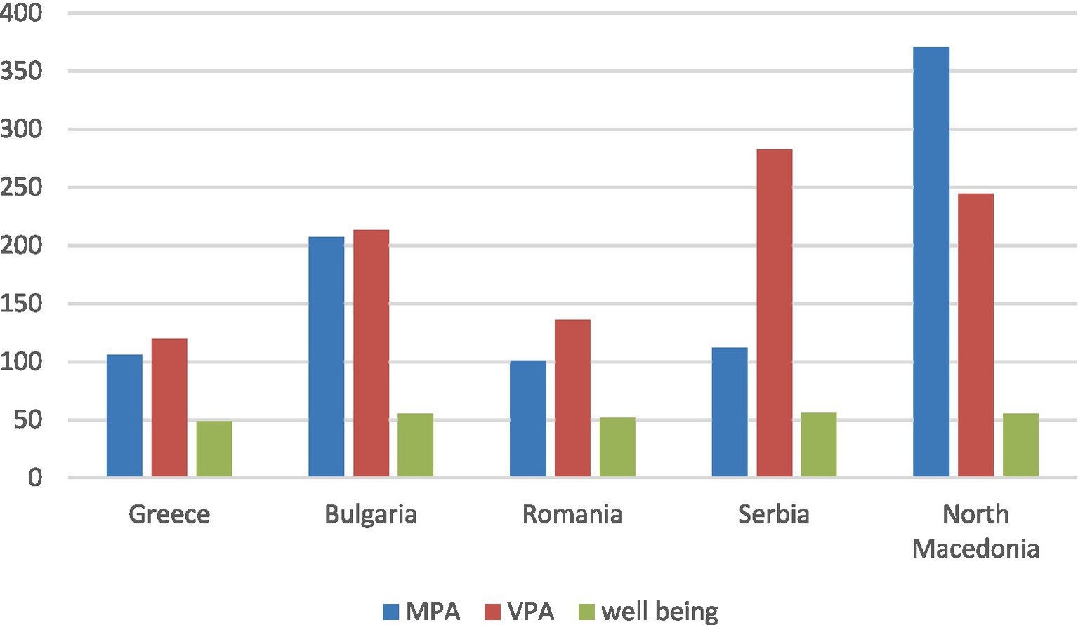 MPA, VPA and well-being scores.