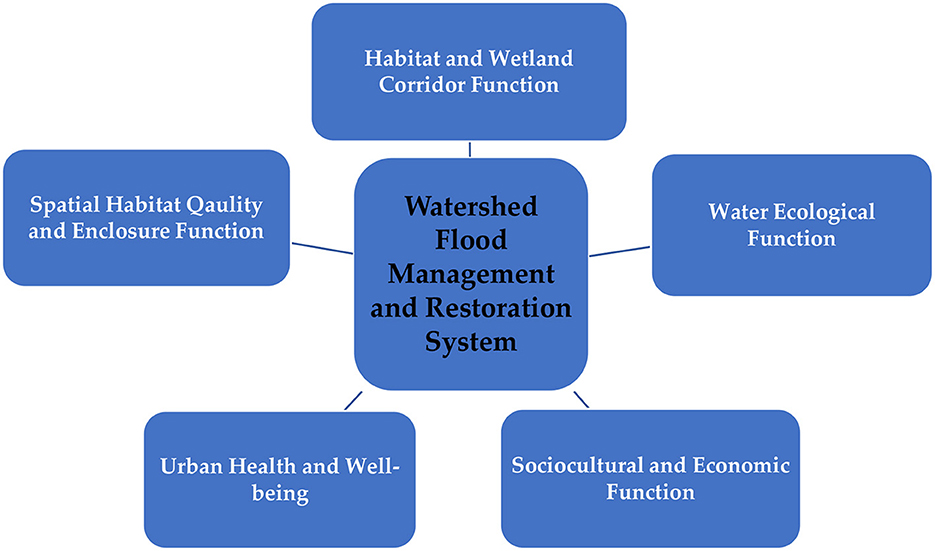 Flowchart titled “Watershed Flood Management and Restoration System” with five connected blue rectangles: “Habitat and Wetland Corridor Function,” “Water Ecological Function,” “Sociocultural and Economic Function,” “Urban Health and Well-being,” and “Spatial Habitat Quality and Enclosure Function.”