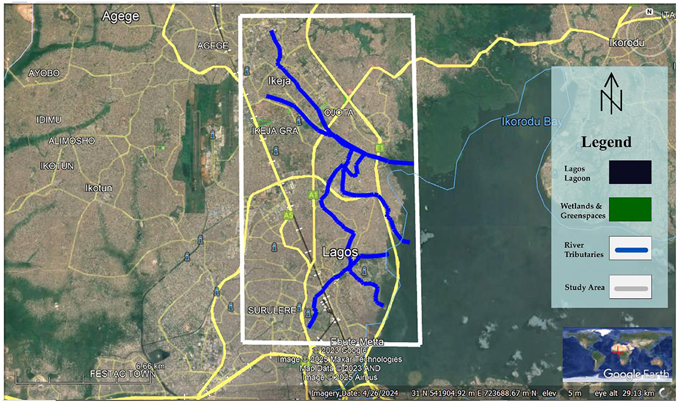 Map of Lagos, Nigeria, highlighting river tributaries in blue, wetlands and green spaces in dark green, and Lagos Lagoon in dark blue. A white rectangle outlines the study area. Major roads are marked in yellow. The map includes a legend and compass rose in the top right corner.