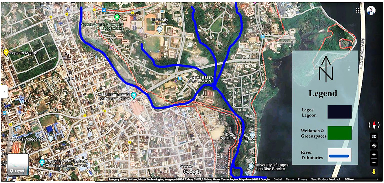 Figure 3. A section of Lagos Mainland, specifically Akoka-Yaba, shows the water tributaries (blue) and runoff from the city flowing into Lagos Lagoon.
