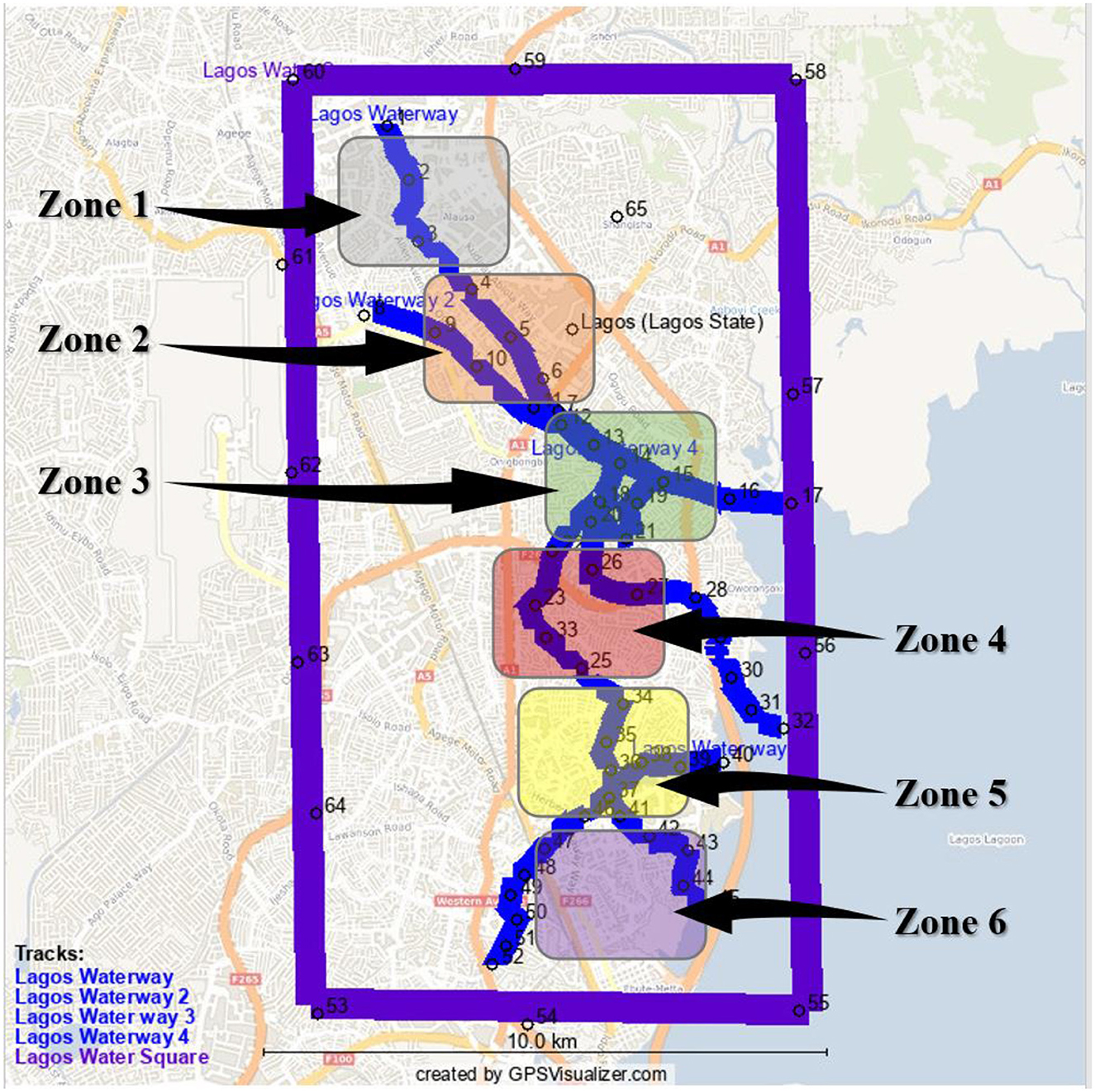 Map of Lagos showing waterway zones with highlighted tracks. Six zones are labeled from one to six. Each zone is marked with different colors, and major waterways are shaded in blue. Coordinates and zone numbers are indicated with arrows. A bold purple border outlines the area.