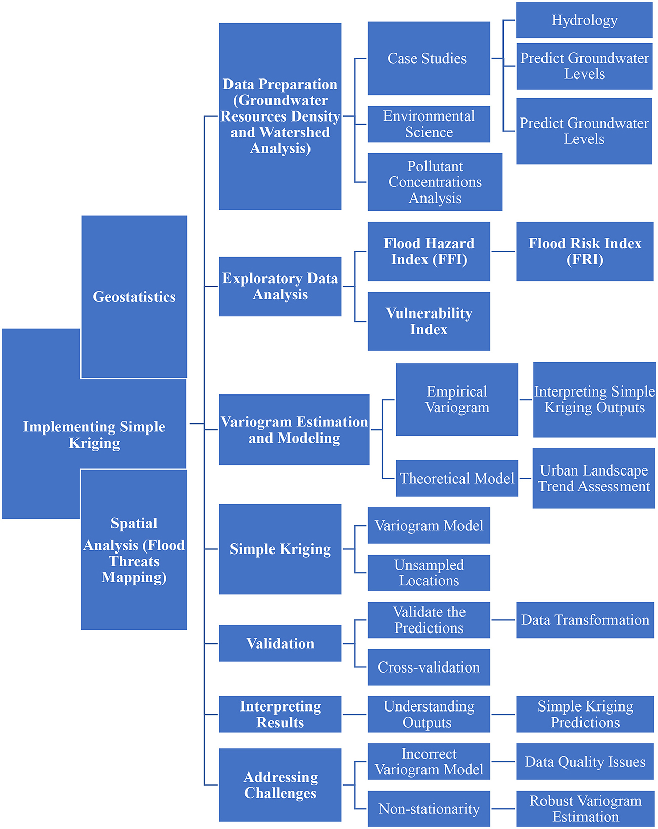 Flowchart illustrating the process of geostatistics for spatial analysis and implementing simple kriging. Key steps include data preparation, exploratory data analysis, variogram estimation, modeling, validation, result interpretation, and addressing challenges. Subtopics cover case studies, pollutant concentration analysis, flood indices, theoretical modeling, varioram models, prediction validation, and data quality issues.