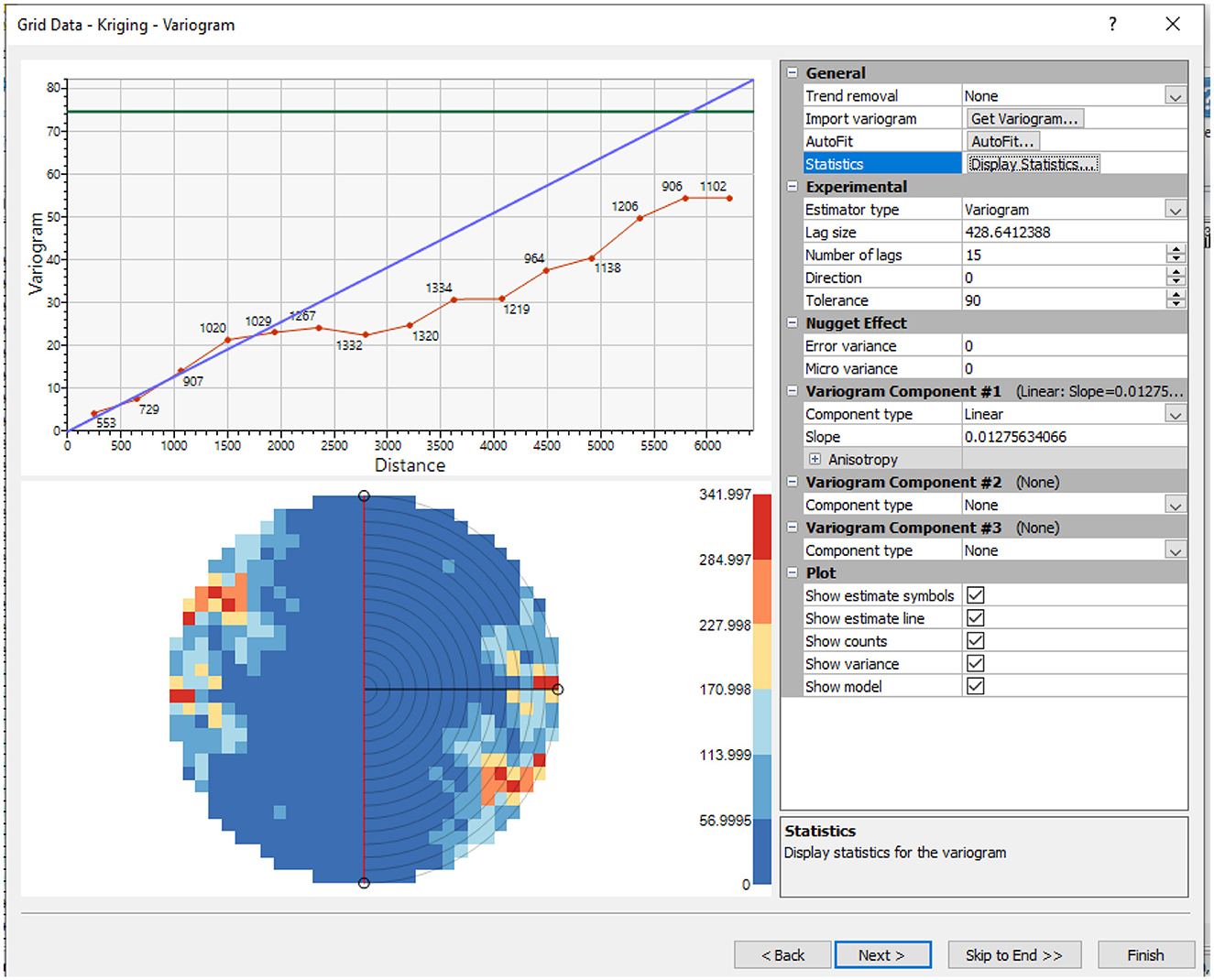 Variogram analysis interface showing a line graph with distance on the x-axis and variogram values on the y-axis, featuring linear and sample variograms. Below is a heat map with concentric circles indicating spatial data distribution. A sidebar displays settings options for trend removal, estimator type, and plot components, alongside variogram statistics.