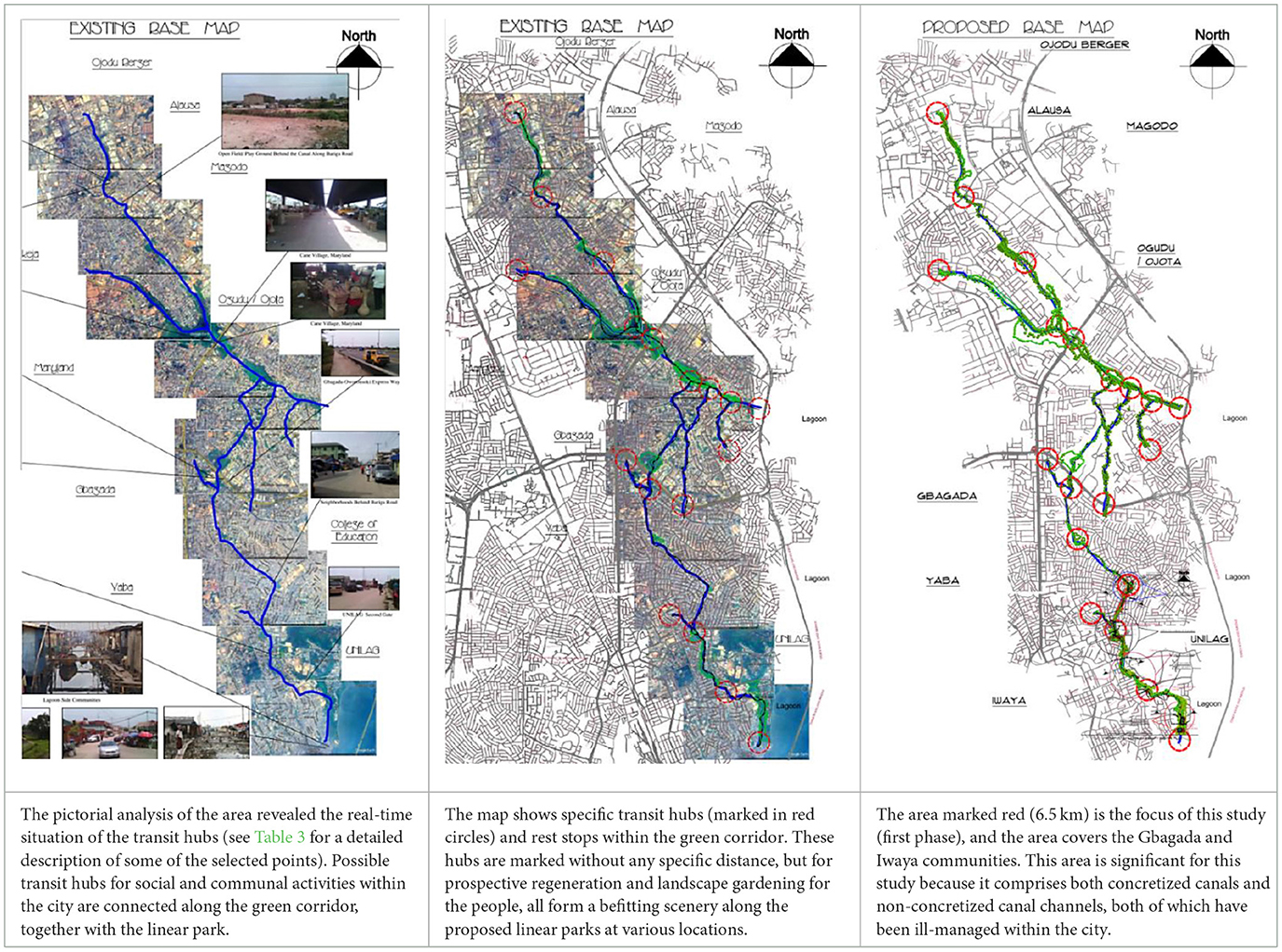 To gather pertinent data and information that addressed the study's purpose and objectives, a contemporaneous triangulation research design was employed in conjunction with a direct research survey. The research area covers a total of 145.68 km2 along the Agindingbi-Obafemi Awolowo Road in Ikeja, passing across the Opebi and Oregun link bridges that connect Ojota and Maryland. The four major waterways and green corridors are all interconnected, covering a total approximate distance of 47 km, as represented in blue color in Figures 24. This green corridor continues through the Bariga district via Akoka, home to the University of Lagos, and it ends at Iwaya. The study area is composed of green corridors, rivers, wastewater, and wetlands of all kinds (bogs, marshes, and swamps). The host neighborhoods around the study area include Yaba, Bariga, Gbagada, Anthony, Maryland, Mende, Somolu, Oworonshoki, Ogudu, Ifako, Ojota, and Ikeja. All of these neighborhoods are connected by lush vegetation, transportation corridors, and river basins.
