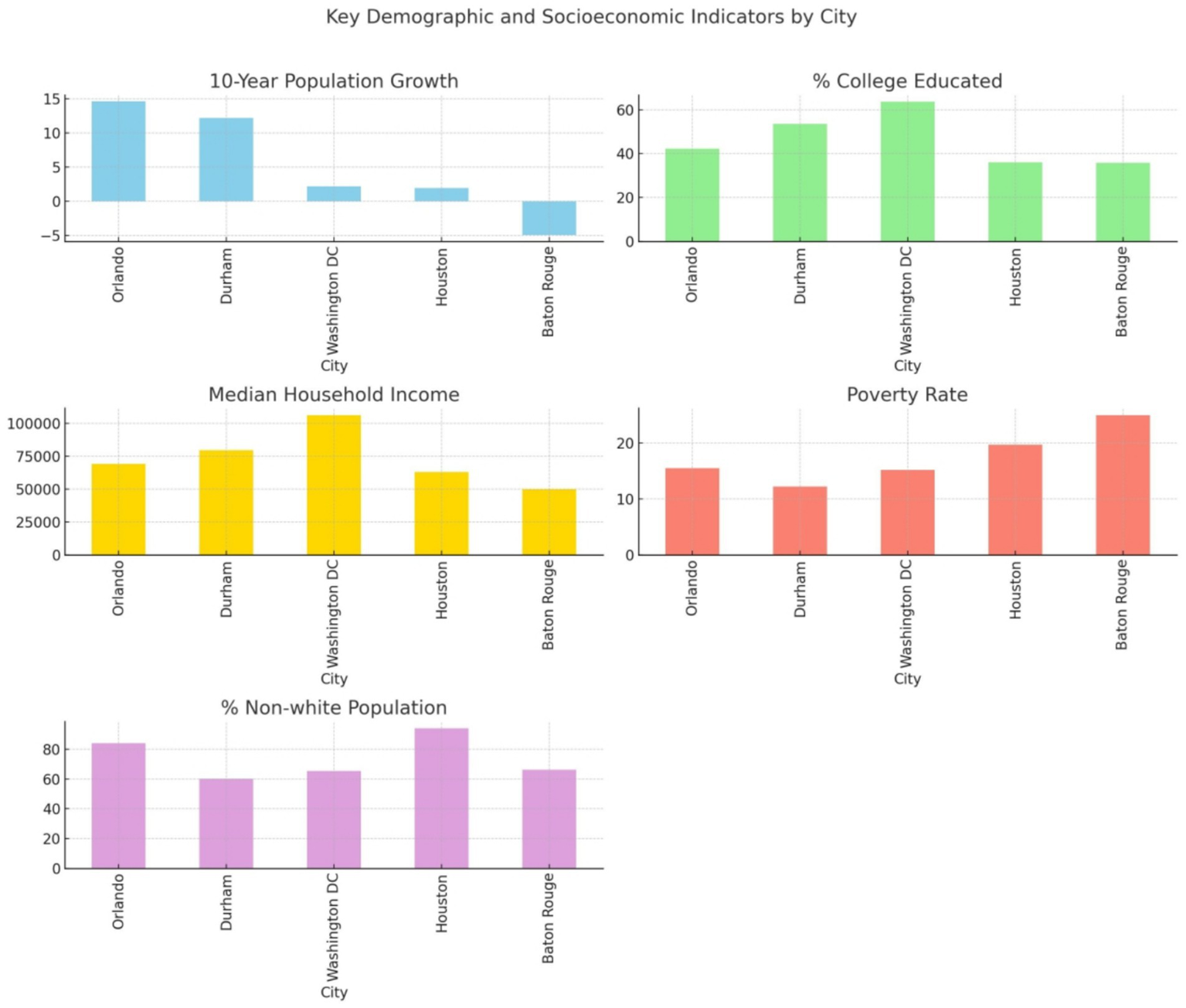 Figure 3 summarizes key demographic differences between the five cities in our sample. The differences in population growth rates are striking with Orlando and Durham showing significant growth over the past 10 years, while Washington, DC and Houston are essentially stagnant, and Baton Rouge experienced declining populations. This is largely due to the aftermath of Hurricane Katrina, which continues to have implications for the area even today. Education levels and household incomes follow predictably similar patterns with both being exceptionally high in Washington, DC followed by Durham and Orlando. Despite these strong indicators, DC’s unemployment rate is relatively high suggesting a strong bifurcation of the population.