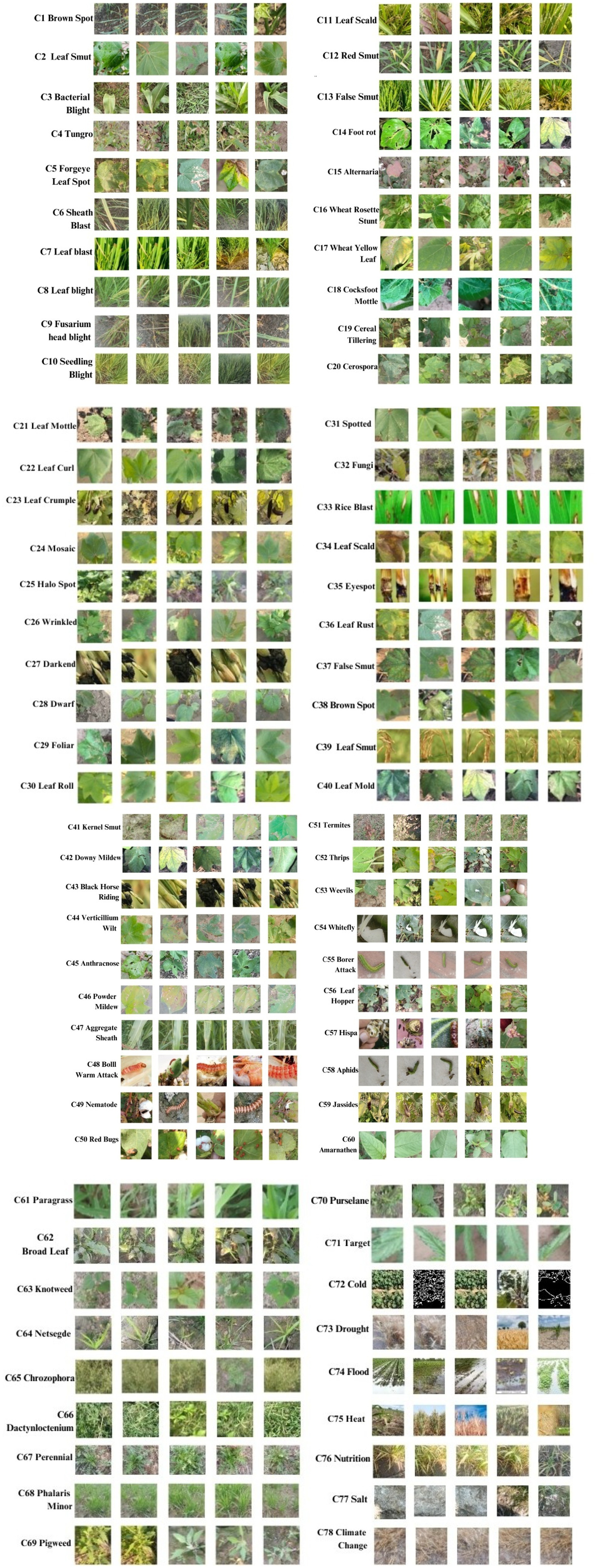 Figure 1. The PSDataset consists of 78 classes, labeled C1 to C78. (Classes C1 to C44 represent biotic stress samples, C45 to C56 cover pest stress samples, C57 to C68 include weed stress samples, and C69 to C78 correspond to abiotic stress samples) (Kaur, 2025).