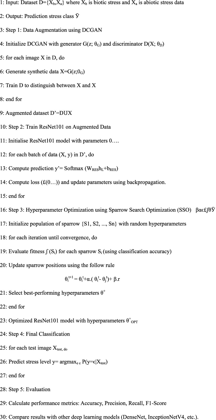 After optimising the hyperparameters using the SSO algorithm, the final ResNet101 model is retrained with the optimal parameters for classification. The softmax layer outputs the final classification for biotic and abiotic stress levels. The classification task is modelled as: