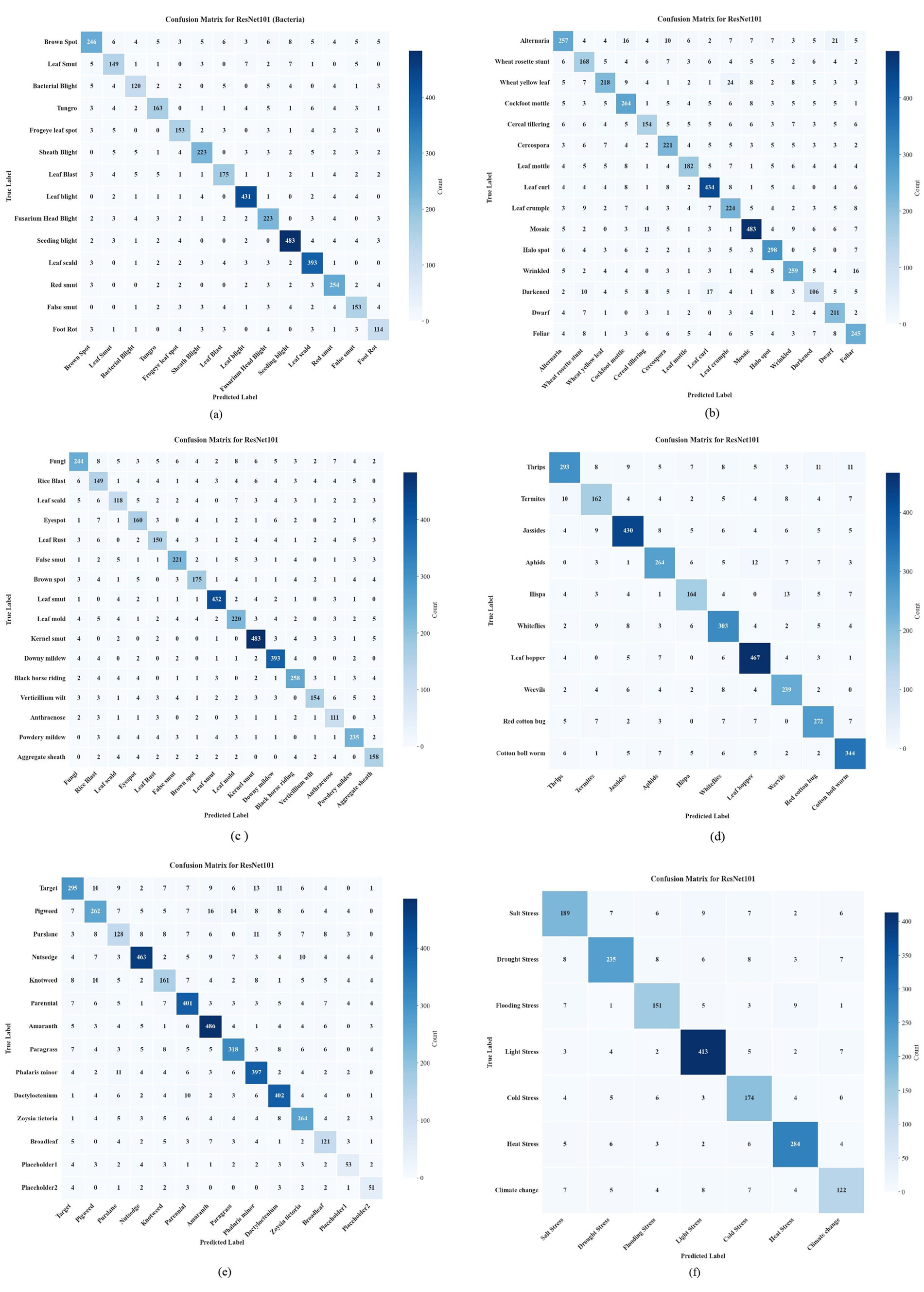 Figure 3. The confusion matrix displays the results for the ResNet101 across different stress classes: (a) bacterial stress classes, (b) viral stress classes, (c) fungal stress classes, (d) pest stress classes, (e) weed stress classes and (f) Abiotic stress class.