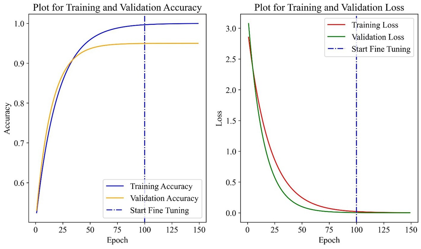 Loss of training and validation accuracy exhibited pertinent patterns in this dataset. At the outset, the models exhibited commendable speed of learning, as seen by the rapid improvement in both training and validation accuracies. Predictably and effectively utilizing the training data, the training accuracy quickly attained a peak level before levelling out. In a manner analogous to the training accuracy, the validation accuracy exhibited an initial surge followed by a plateau. Following epoch 100, the accuracy of the model remained mostly unaffected by the fine-tuning, since there was no statistically significant change seen.
