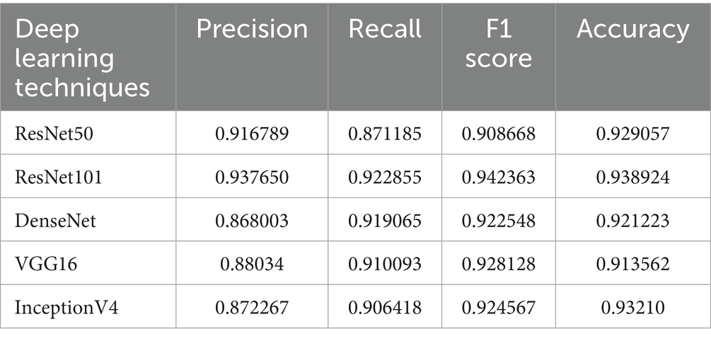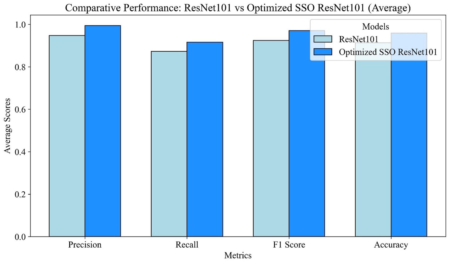 Figure 6 presented the performance comparison of the ResNet101 with the optimised ResNet 101 with SSO, which consistently outperforms its competitors on important performance metrics like accuracy, precision, Recall, and F1 score. This is because it can reliably identify true positives, keep the ratio of false positives to negatives under control, and accurately predict positive cases. This enhancement results in increased overall accuracy, which in turn makes the optimised model more reliable. Thus, optimisation methods like Sparrow Search Optimisation improve the performance of deep learning models without skewing any of the metrics used for evaluation. While the impact of these advancements on real-world applications is significant, it is important to note that actual gains may differ and that future research should focus on optimising for specific use cases.