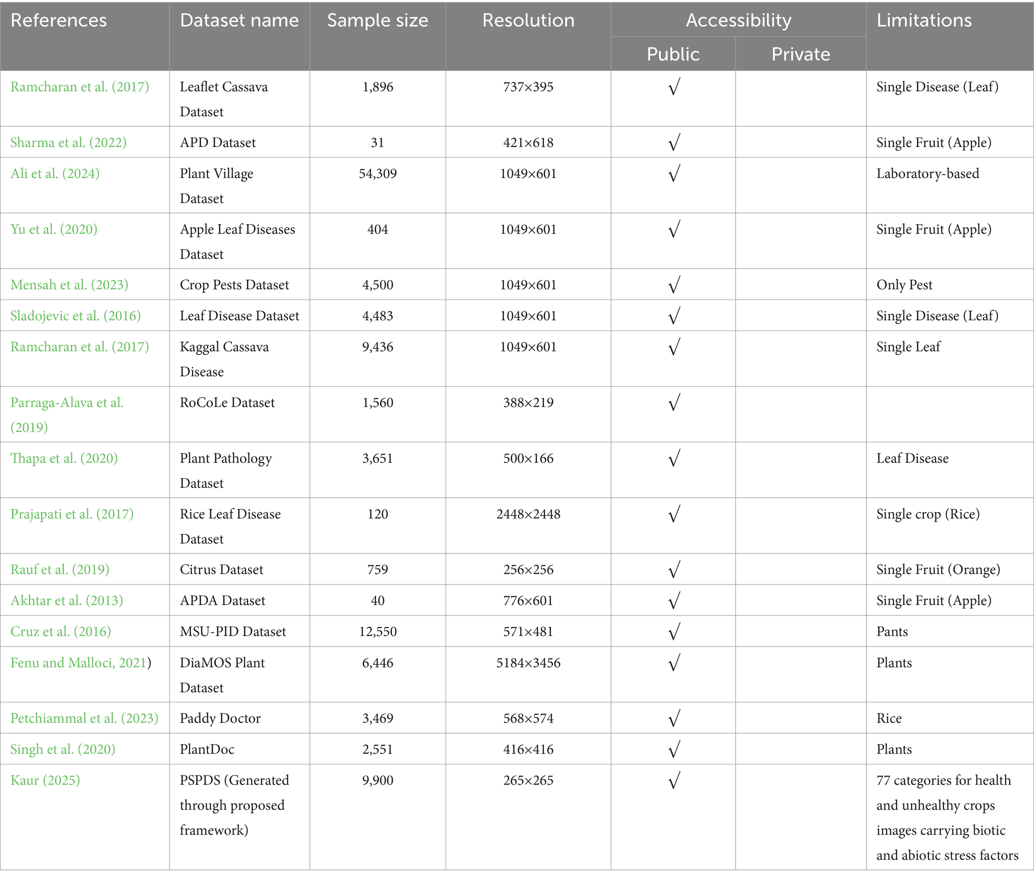 Moreover, while databases such as the Deep Phenotyping dataset and the DiaMOS Plant Dataset make essential contributions (Fenu and Malloci, 2021), they underscore the need for more complete and diverse picture data. Despite its virtues, the field has certain weaknesses. Many existing models and datasets have low diversity and representativeness, as they focus on certain diseases or crops. A lack of adequate data makes it difficult to create models that are robust and universally applicable. Table 1 shows a comparative analysis of these datasets. Furthermore Nagasubramanian et al. (2022) demonstrate the interpretability of deep learning models. To make these models understandable and actionable, it is critical to focus on relevant attributes. These inadequacies emphasise the need for new datasets that include a wider variety of plant stress factors, including environmental and nutritional implications, as well as novel deep learning architectures that may be used to better navigate the complexities of real-world agricultural environments. Currently, there is no comprehensive dataset that encompasses various crops, disease kinds, and stress variables under various situations. Furthermore, these datasets are not necessarily highly detailed or appropriate. A new, more comprehensive dataset is required to increase the precision, resilience, and practicality of plant stress identification and classification methods.