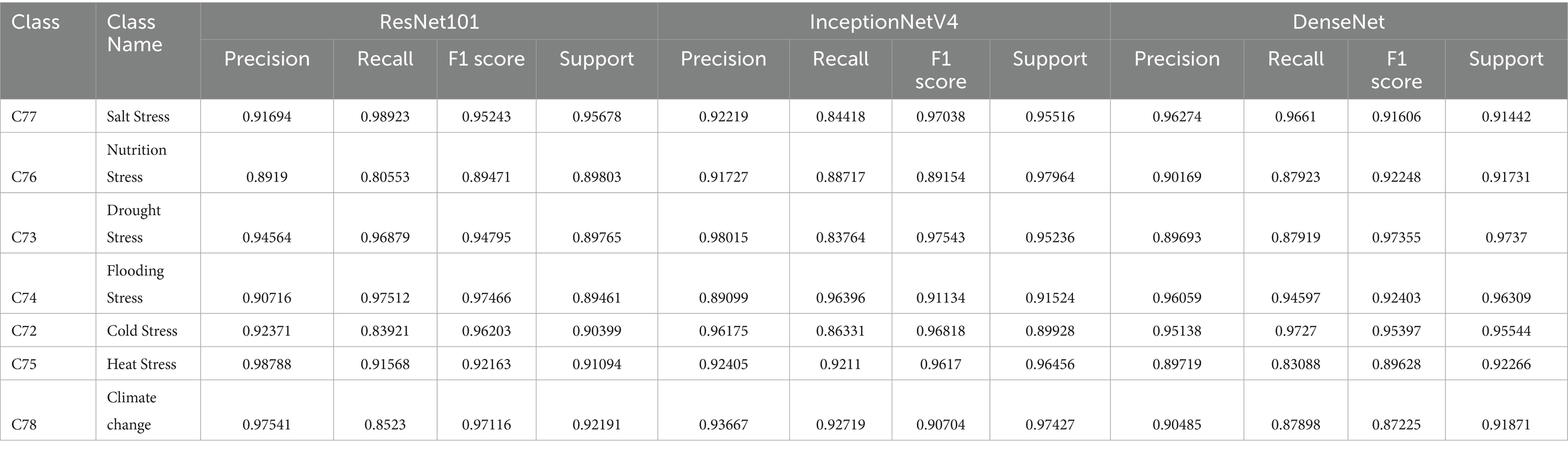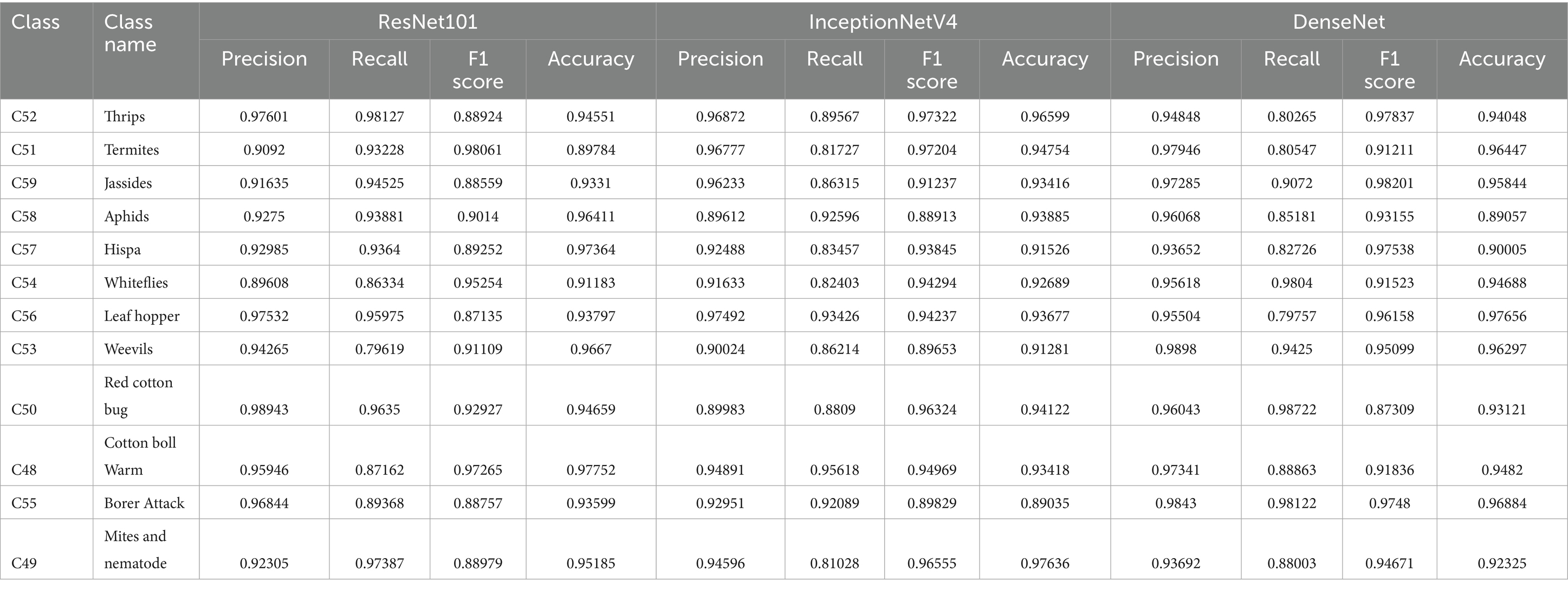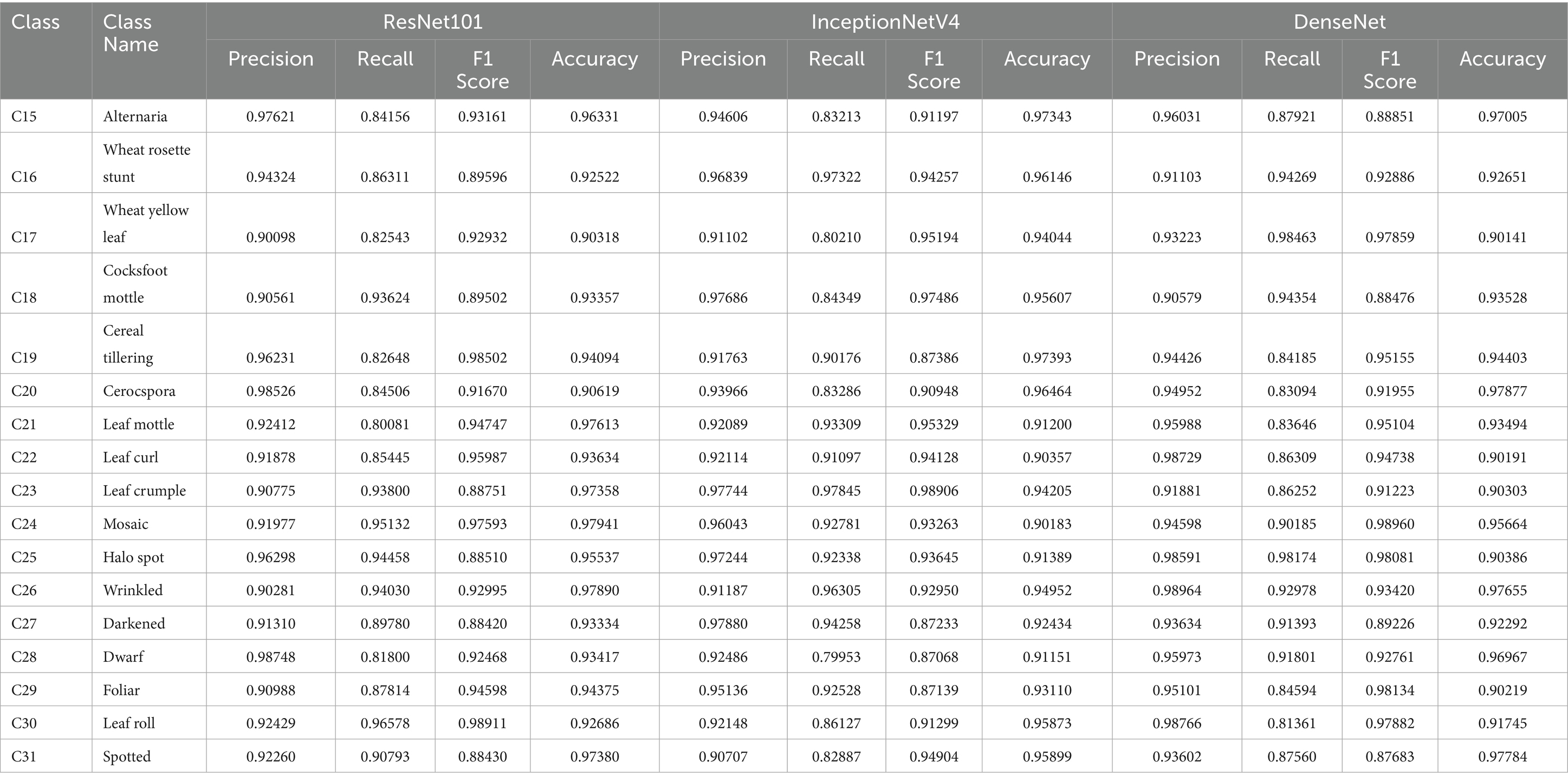 Together, these results illustrate that while deeper networks like ResNet101 and InceptionNetV4 tend to offer higher sensitivity and nuanced classification, lighter models such as DenseNet provide efficiency gains at some cost to detection consistency. This trade-off is critical for selecting appropriate models tailored to the operational demands and resource constraints of urban agriculture systems. Figure 3 present the class wise confusion matrix results. Tables 3–8 present the class-wise learning matrices results.