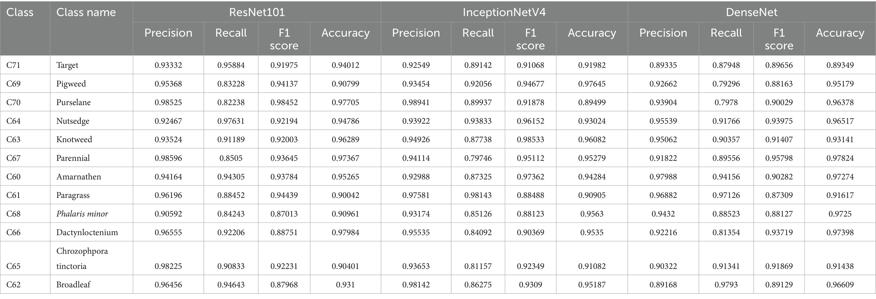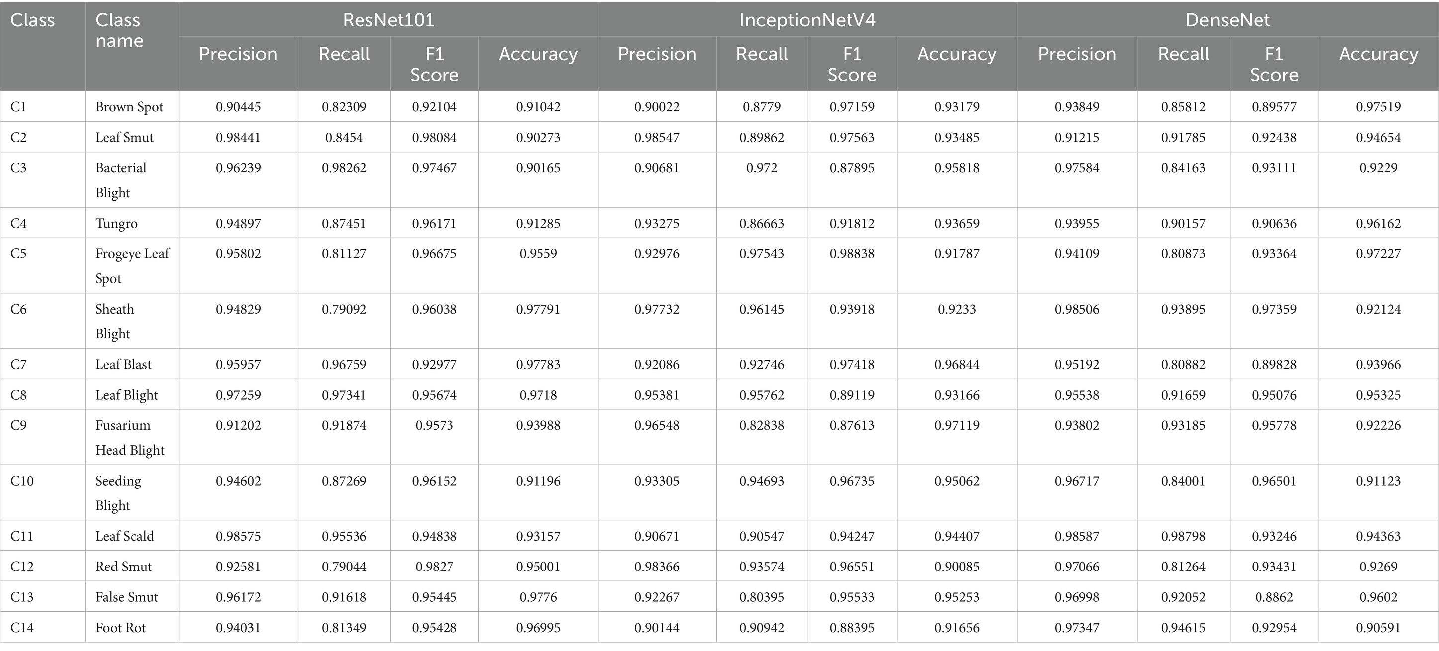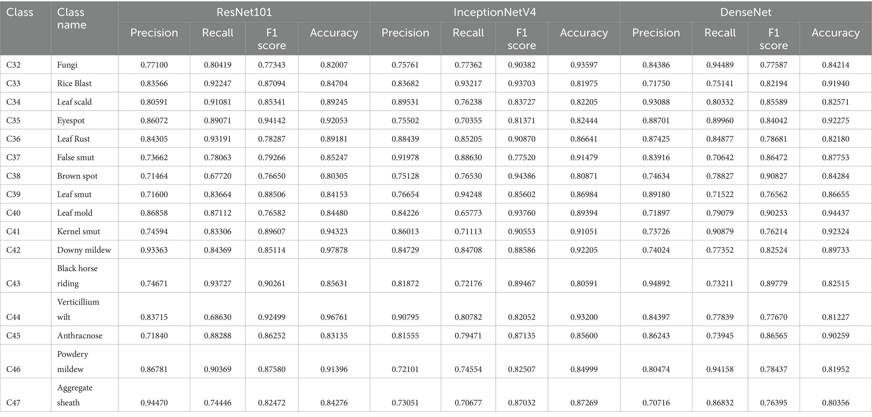 Together, these results illustrate that while deeper networks like ResNet101 and InceptionNetV4 tend to offer higher sensitivity and nuanced classification, lighter models such as DenseNet provide efficiency gains at some cost to detection consistency. This trade-off is critical for selecting appropriate models tailored to the operational demands and resource constraints of urban agriculture systems. Figure 3 present the class wise confusion matrix results. Tables 3–8 present the class-wise learning matrices results.