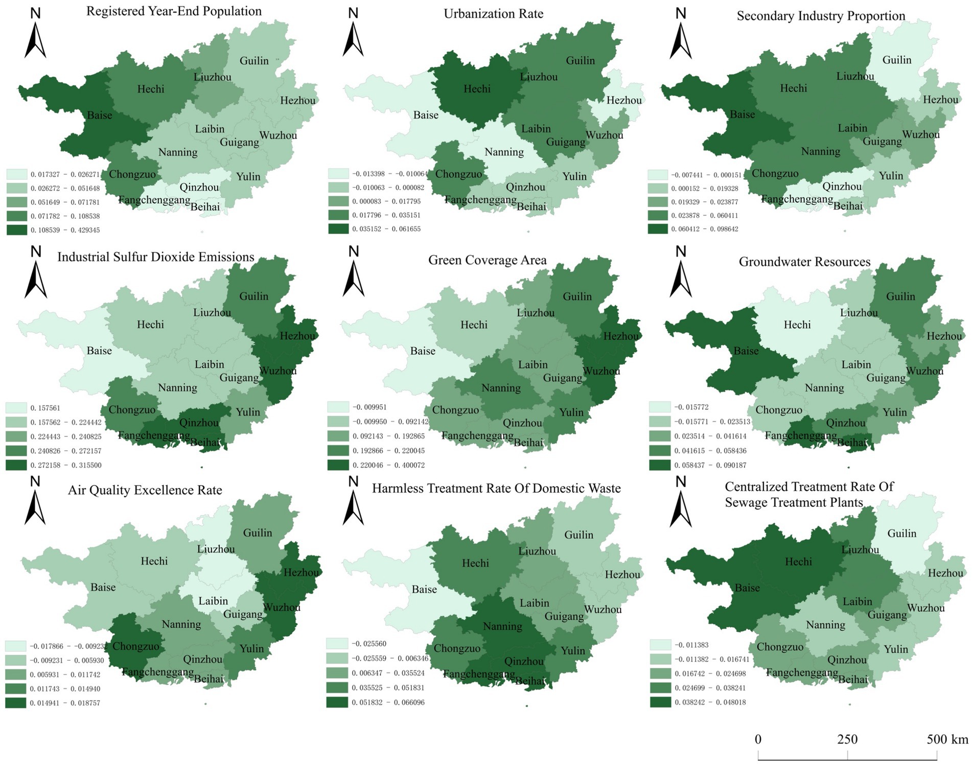 In sum, these spatial and temporal shifts in population, industrial emissions, green coverage, air quality, and wastewater infrastructure underscore complex interactions between regional development, environmental policies, and geographic factors, reflecting broader patterns identified in international green economy research.
