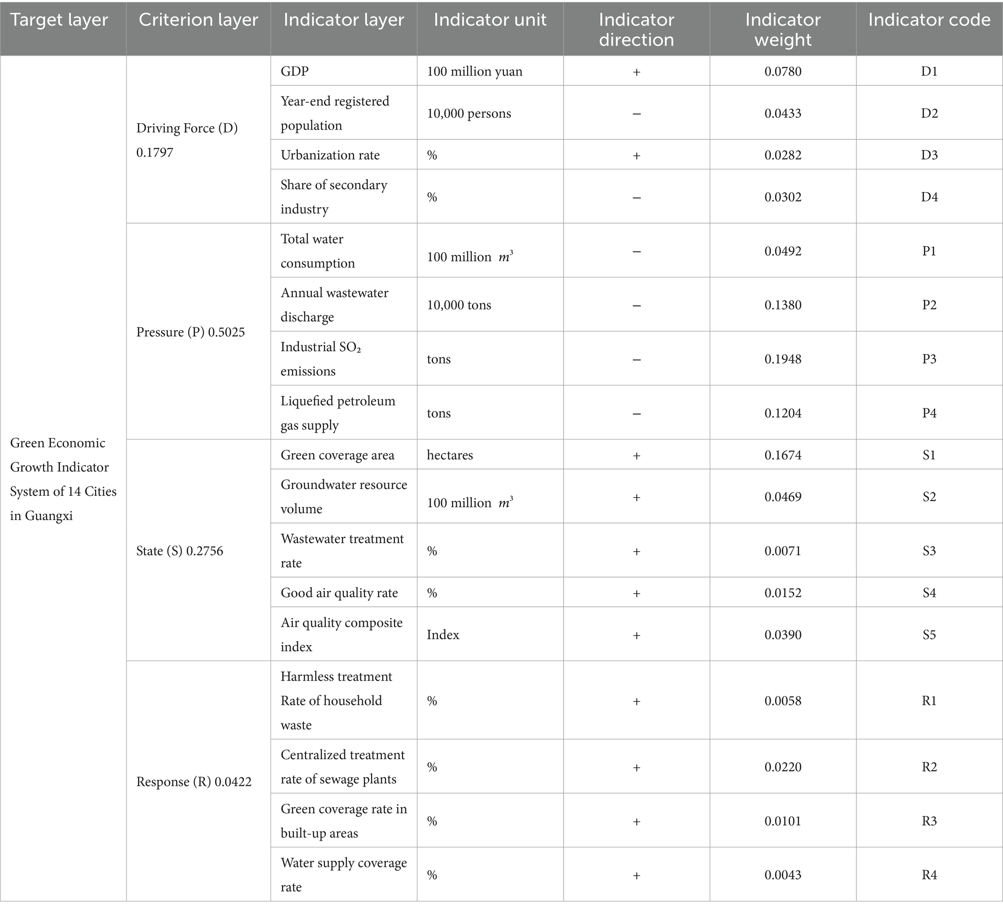 In this study, indicators such as registered year-end population and urbanization rate are assigned to the Driving layer, representing socio-economic drivers. Indicators reflecting environmental pressures, including wastewater discharge and industrial sulfur dioxide emissions, are categorized under the Pressure layer. Measures of environmental conditions, such as air quality compliance rate and groundwater resource volume, represent the State layer. Lastly, management responses, including the harmless treatment rate of domestic waste and green coverage rate in built-up areas, are placed in the Response layer.
