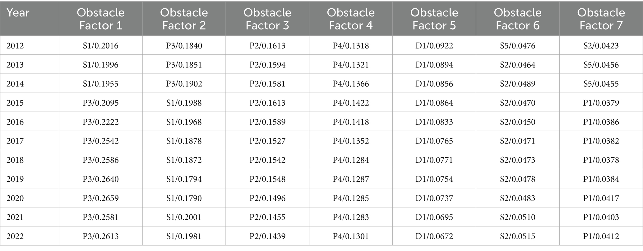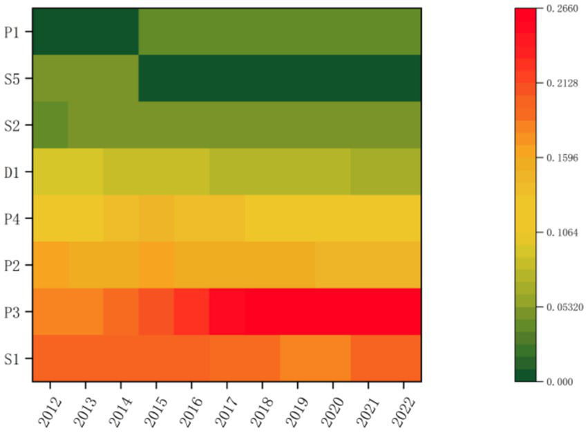 Building upon the methodology proposed by Shu et al. (2024) and other scholars—who advocate for diagnosing systemic obstacle factors prior to investigating influencing factors—this study employed Equations 1, 2 to calculate and rank the obstacle degrees of 17 evaluation indicators pertaining to Guangxi’s green economic development between 2012 and 2022. Due to space constraints, the top seven indicators were selected for detailed statistical analysis, as presented in Table 3.