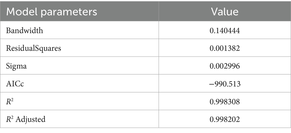 The GTWR model offers key advantages over traditional methods: it captures spatial and temporal heterogeneity (Fotheringham et al., 2015), provides localized parameter estimates revealing regional differences (Li et al., 2021), and identifies spatial clusters of influencing factors critical for targeted green economy policymaking (Matthews and Yang, 2012).
