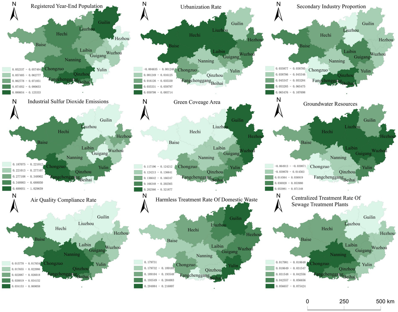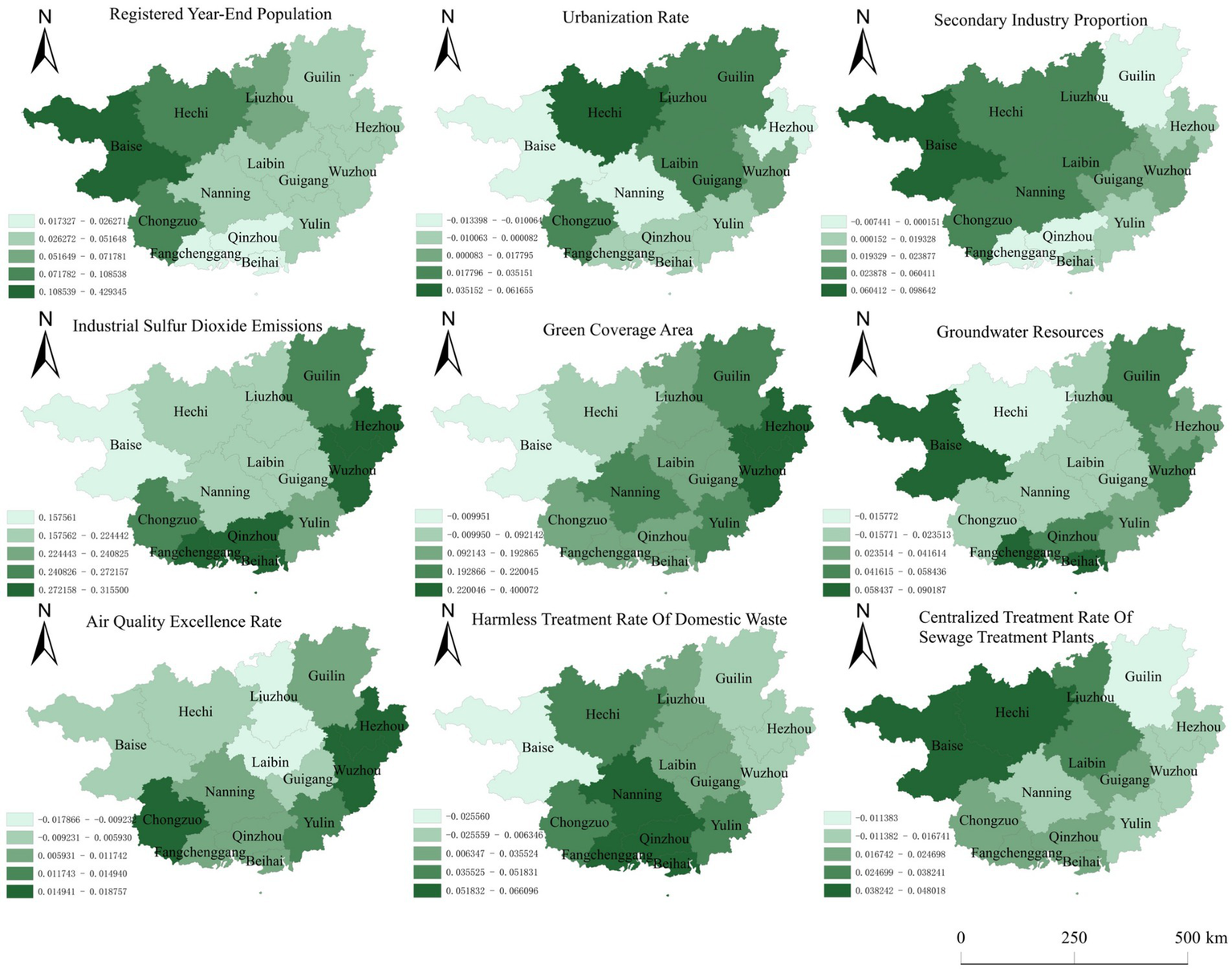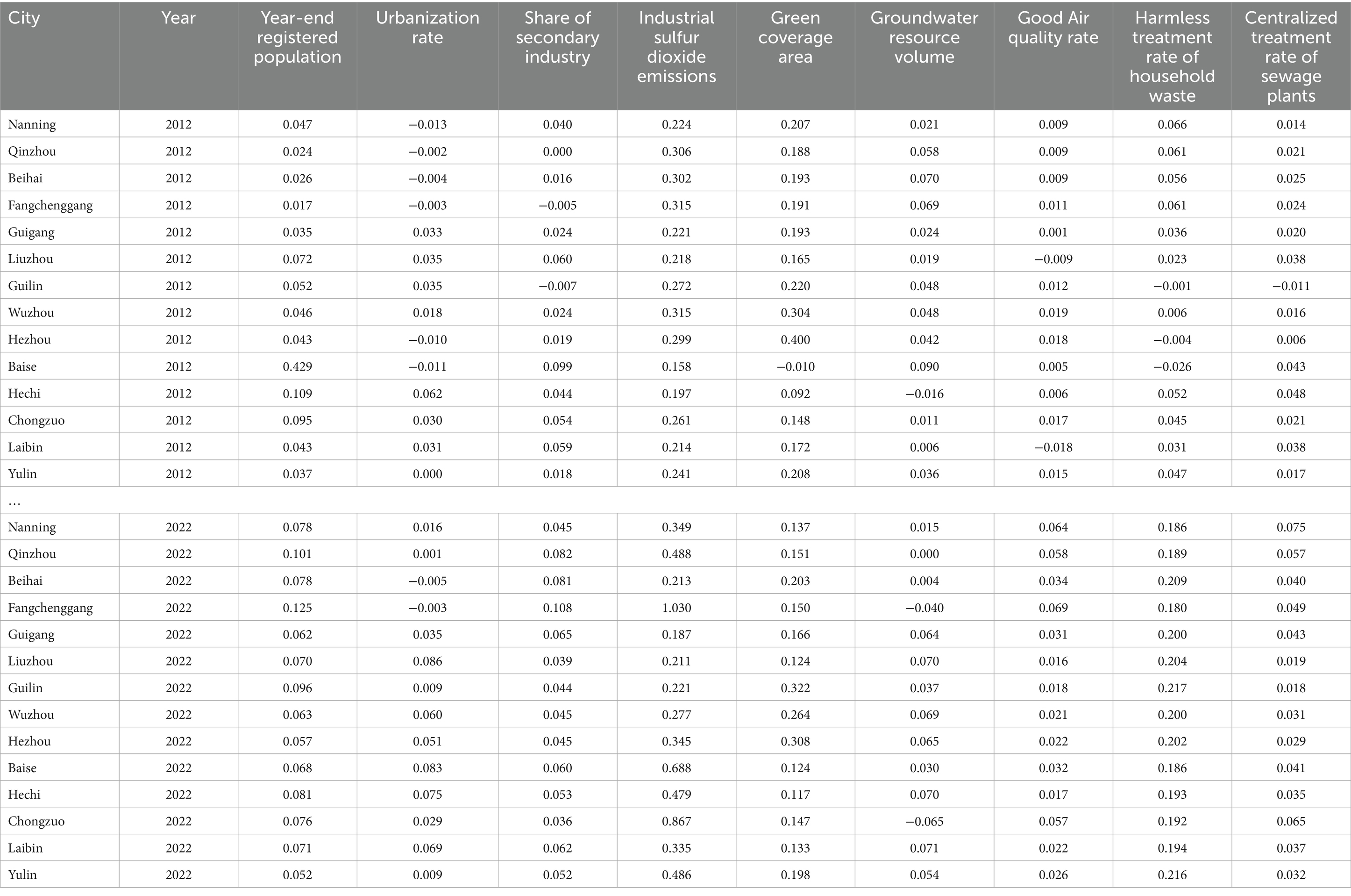 At the indicator level, industrial sulfur dioxide emissions carry the highest weight at 0.1948, emphasizing the critical role of air pollution control in Guangxi’s green economic development. This reflects the province’s industrial legacy, characterized by a dominance of heavy industry, high pollution, and energy-intensive sectors (Yang et al., 2023). The second highest weight is green coverage area at 0.1674, highlighting the importance of ecological infrastructure in providing environmental services such as water conservation, air purification, climate regulation, and biodiversity support—factors that foster new green industries like ecological agriculture and eco-tourism (Mo et al., 2024).
