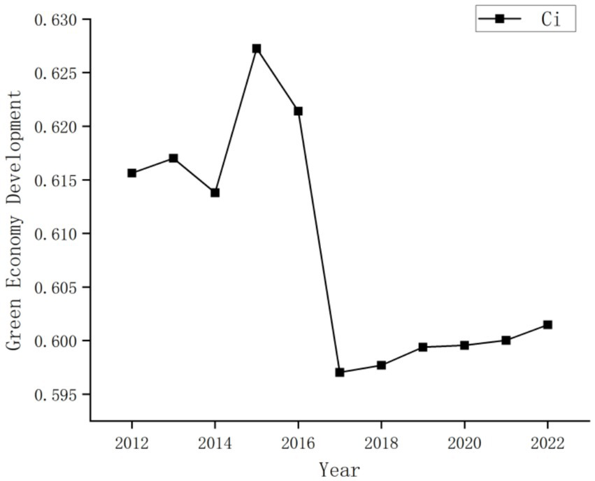 Guangxi’s overall green economic development remained within the development stage over the decade, exhibiting modest fluctuations. The Ci rose from 0.6156 in 2012 to 0.6273 in 2015, declined to 0.5970 by 2017, and recovered to 0.6015 by 2022.