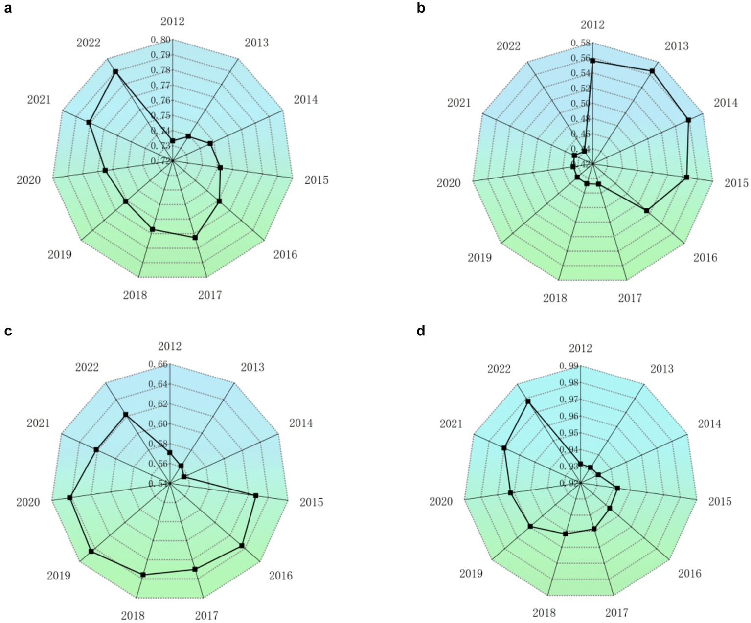Evaluation results of the level of green economy development of guangxi subsystems, 2012–2022. Panel (a) at the top-left represents the Driving Force dimension; panel (b) at the top-right represents the Pressure dimension; panel (c) at the bottom-left represents the State dimension; and panel (d) at the bottom-right represents the Response dimension.
