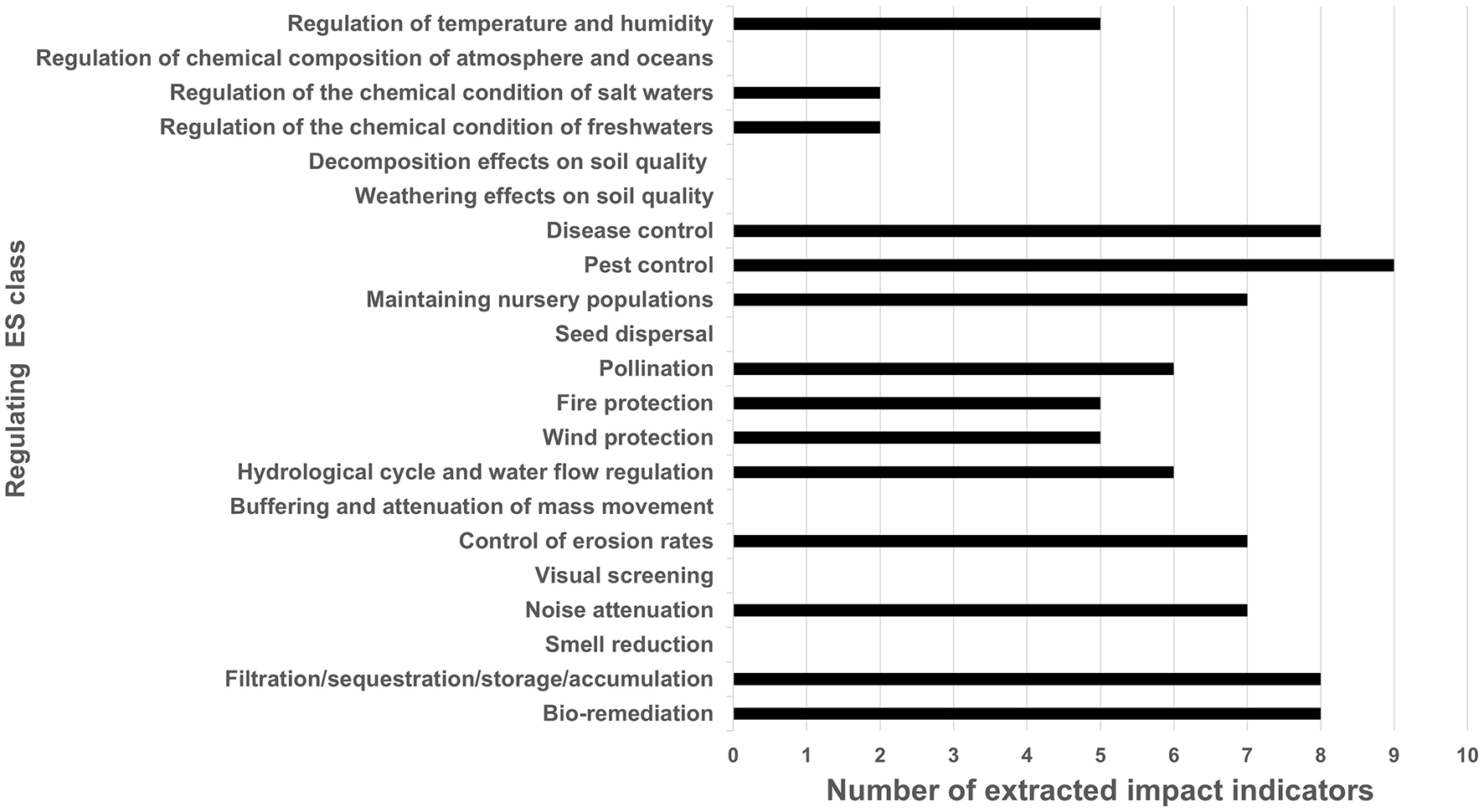 Number of extracted impact indicators for regulation ES from the literature based on the CICES framework (for the full name of each regulating ES class see Appendix A).
