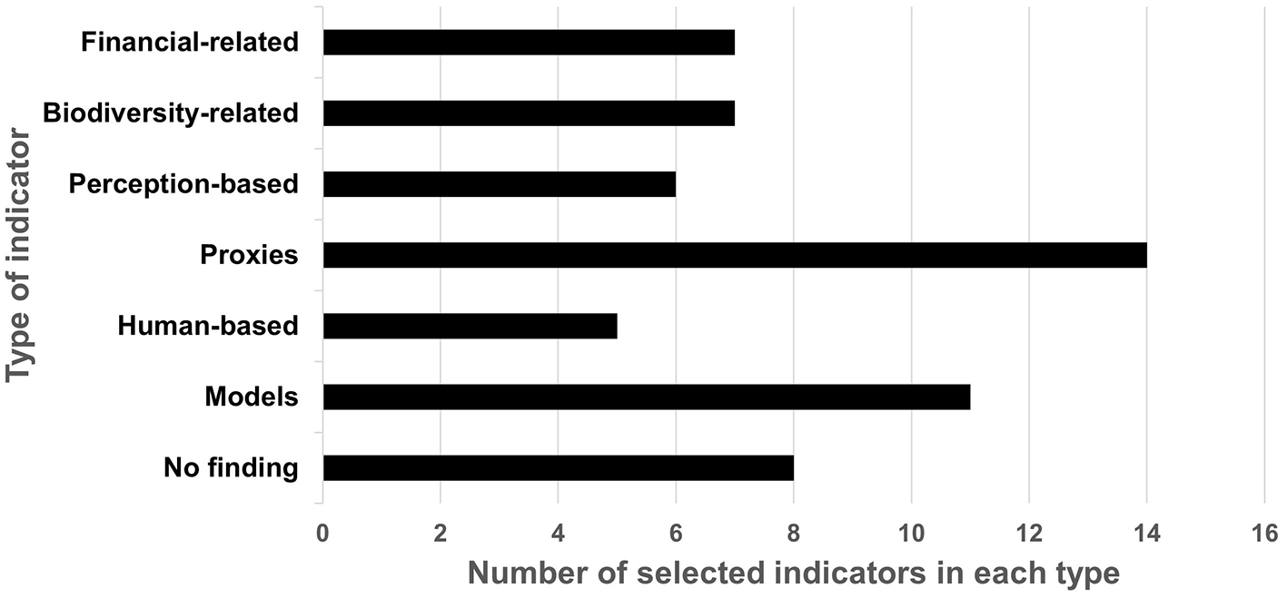 Among the three ES in this group, studies widely examine pollination (2.2.2.1) and the effects and impacts of maintaining nursery populations and habitats (2.2.2.3) in urban and non-urban areas. In comparison, the seed dispersal (2.2.2.2) search query for UB results in two outcomes, none of which revealed any relevant indicator for SIA purposes. We anticipated the outcomes in this case since most of the literature covers the pollination issue, which holds higher priority in urbanized areas. Five papers were fully screened on pollination ES, resulting in three extracted indicators falling into three categories: biodiversity-related, financial-related, and models. As pollination, ES is wholly dependent on natural elements and the vectors of pollens, the biodiversity variables, such as the functional diversity of arable plants, bees, or butterfly species abundance, are eligible indicators for measuring the functionality of this ES and understanding the direct socio-cultural benefits they generate (Balzan et al., 2020). Regarding the preservation of biodiversity features, citizens' willingness to pay, like previous ES, can be a comparative indicator of the effectiveness of this ES on society (ibid). Biophysical attributes of the urban environment, like density, biological diversity, and landscapes available for nesting (Jansson and Polasky, 2010), are determining variables for the function of pollination. Other studies have previously discussed pollination's extensive economic and socio-cultural benefits (Hein, 2009; Lonsdorf et al., 2020). In contrast, the indicators in this study focus on pollination ES's functionality and its procedures to render the extension of service delivery.