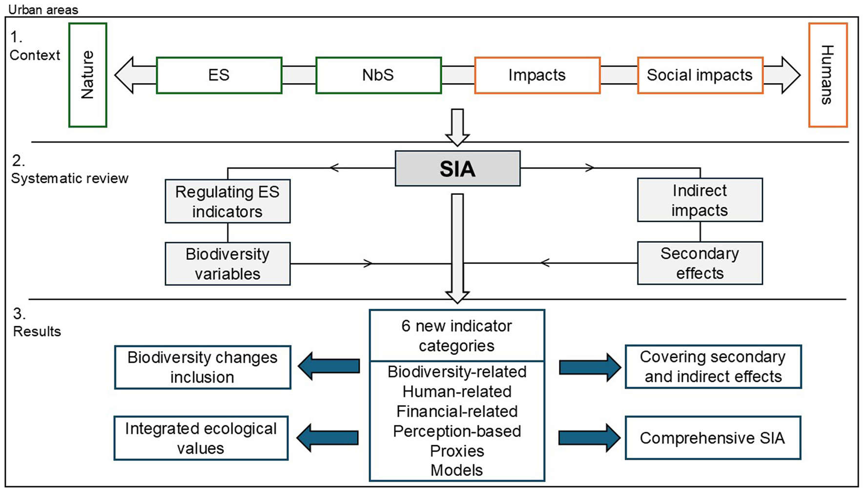 General procedure of the research for social impact assessment (SIA) of nature-based solutions (NbS) in urban areas using (regulating) ecosystem services (ES) indicators and emergence of biodiversity related indicators as new category alongside new categorizations of impact indicators.