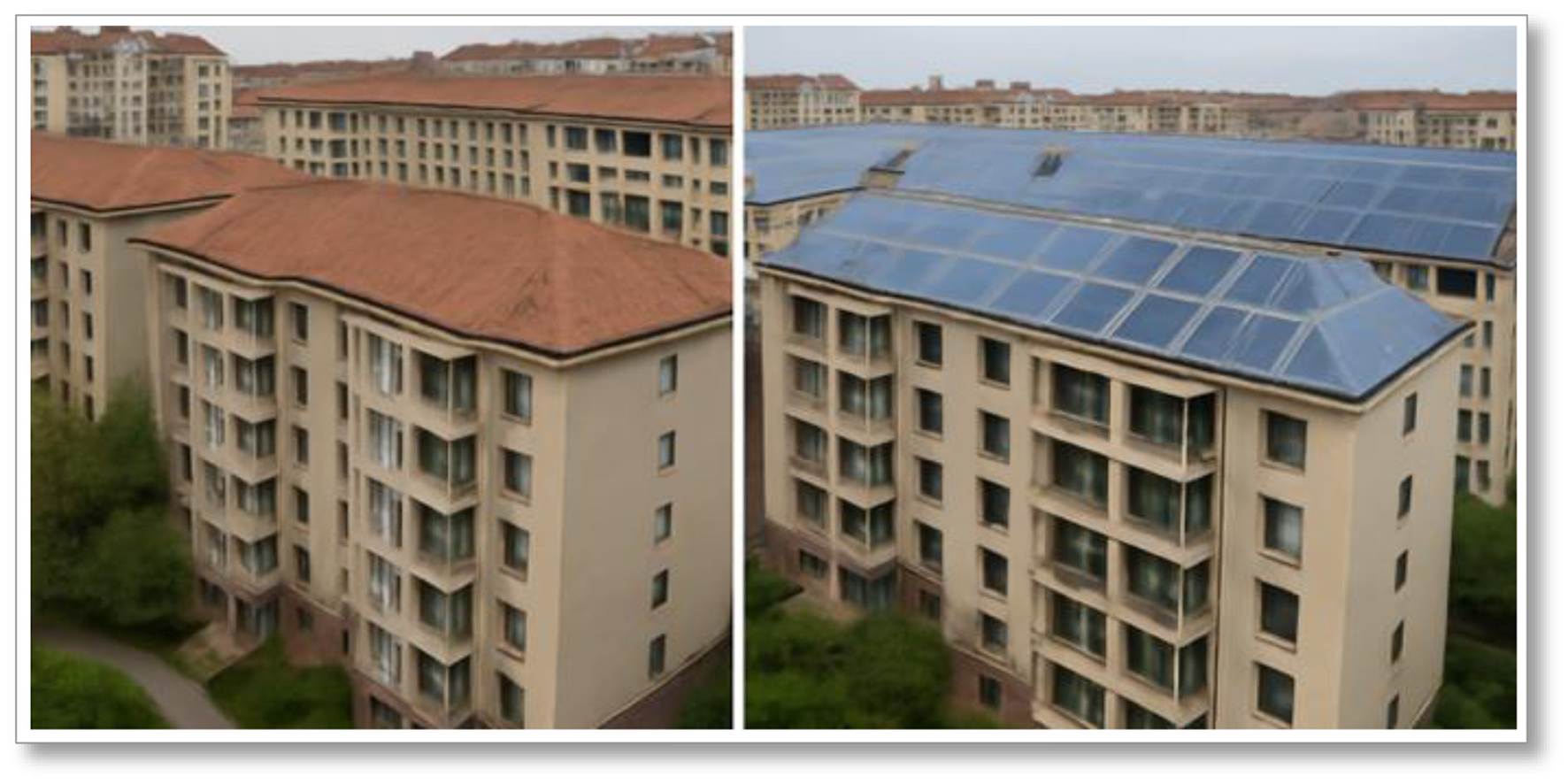 Comparison of rooftops between a regular community and a low-carbon community.