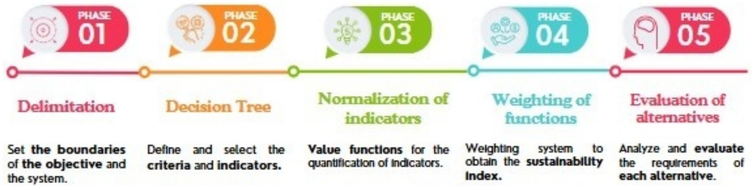 MIVES is a decision-making approach that distinguishes itself by incorporating multiple criteria to assess different alternatives within a problem employing a sustainability index (SI). This SI is derived from the weighted sum of the evaluations across the various considered criteria and indicators (Josa et al., 2020). This method encompasses five distinct phases (Figure 1).