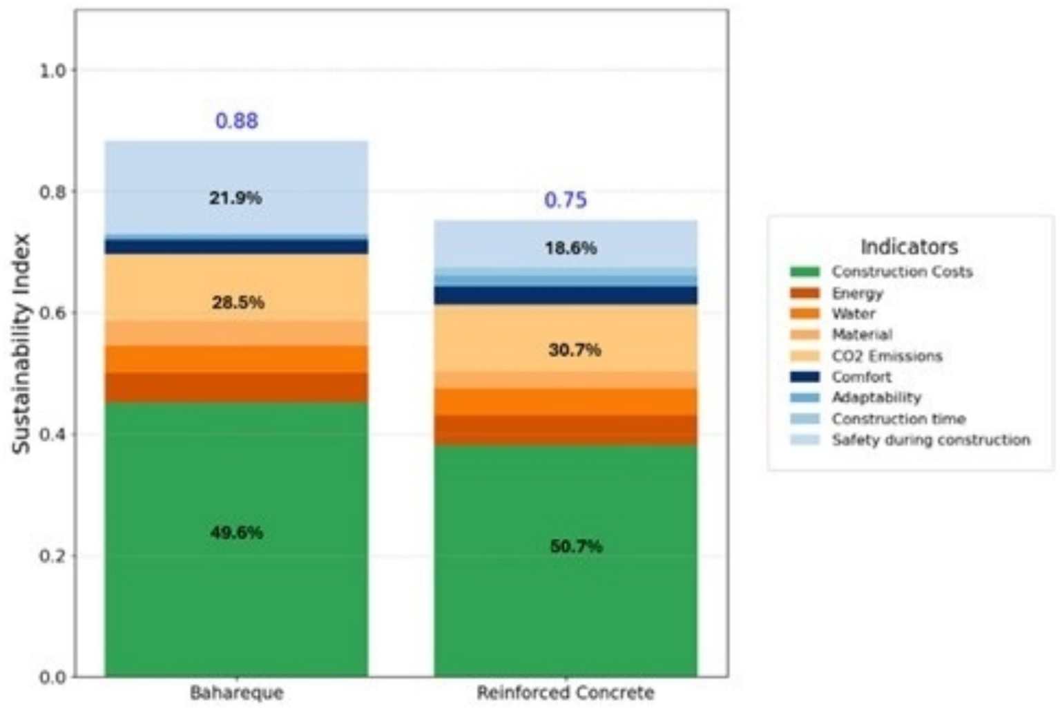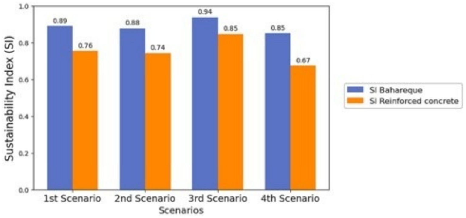 Figure 4 shows the results of the Sustainability Index for the bahareque and reinforced concrete systems. The bahareque system achieved a higher index (0.88) compared to reinforced concrete (0.75), reflecting its better performance in terms of construction costs, lower environmental impact, and social advantages. In the breakdown by indicators, bahareque stood out especially in construction costs, CO₂ emissions, thermal comfort and adaptability. For its part, reinforced concrete showed strengths in safety during construction and in the availability of more industrialized materials.