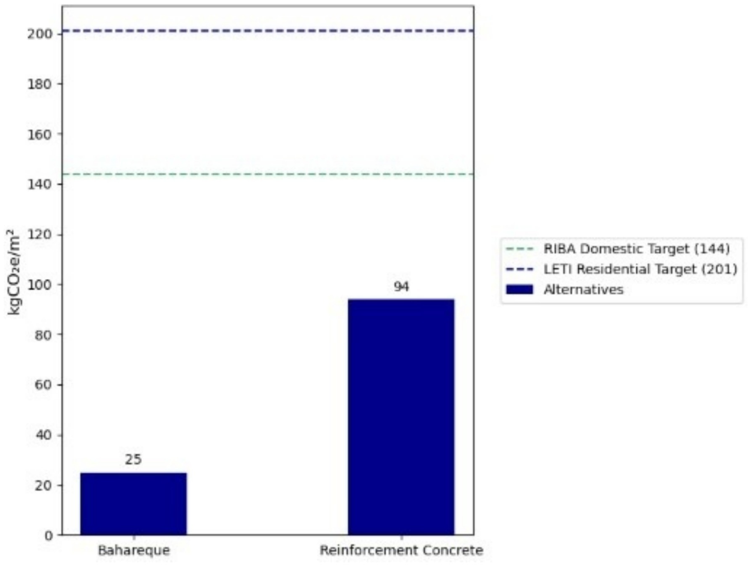 For indicator I5 (CO₂ emissions), a comparative life cycle assessment (LCA) of both construction systems: Bahareque and reinforced concrete were carried out. This analysis aimed to determine the amount of carbon incorporated in each structural phase, from manufacture to construction, and to evaluate which of the two options is more sustainable in terms of carbon emissions, in line with international sustainability standards. The analysis focused on the structural phases of each building system, considering a 40-year lifespan. Phases between A1 and A5 were evaluated, ranging from the manufacture of materials (A1-A3), their transportation to the construction site (A4) and the waste generated during the construction process (A5). The scope included only structural elements and associated embodied carbon emissions (Tello-Ayala and Narvaez-Moran, 2022).