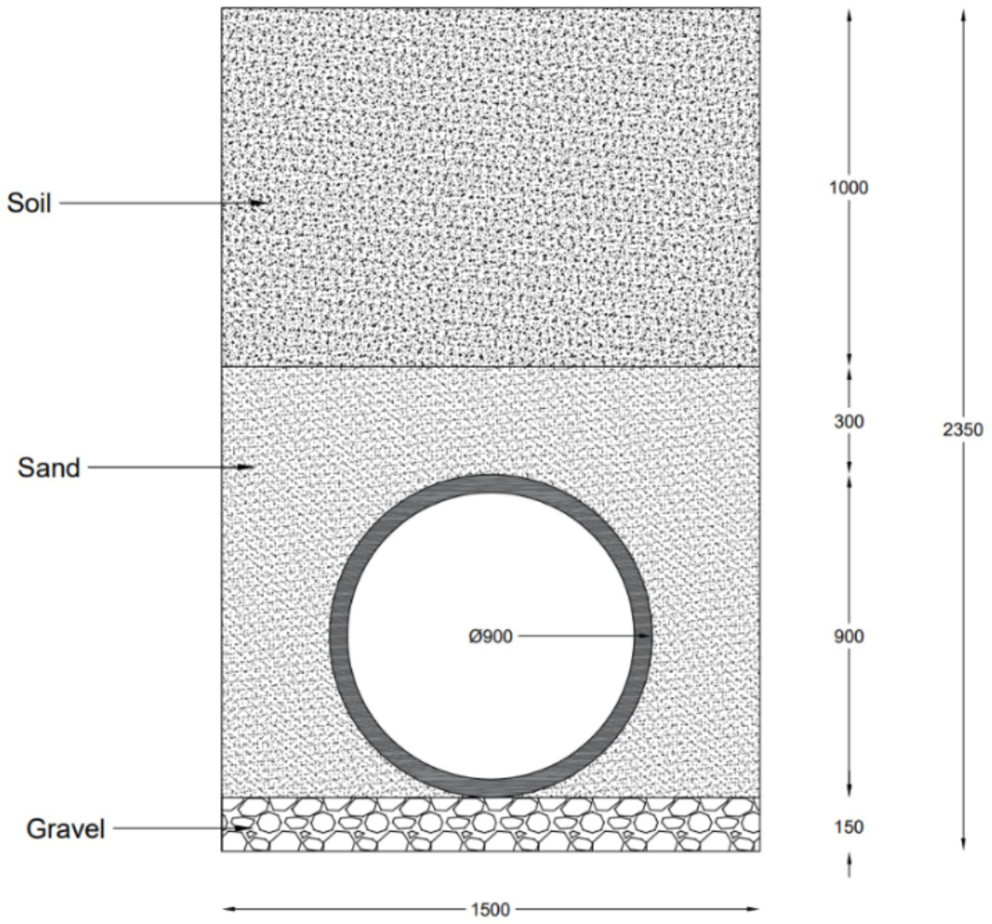 For the trench, data was collected from Dubai Pipes Factory, Abu Dhabi Pipe Factory, and Naffco Flow Control Factory. The density of the gravel and sand was chosen to be 1,680 and 1,682 kg/m3, respectively. The bedding consists of gravel and should have a minimum thickness of 150 mm, as shown in Figure 3. The bedding acts as a foundation in the trench on which the pipe will be placed. As for the backfilling, the depth of the sand layer is 150 mm plus the pipe diameter. Hence, the compacted sand is utilized up to 450 mm from the bedding, as shown in the example trench illustration, where a 300 mm pipe was utilized. The sand is compacted in four layers. Above the compacted sand, the excavated soil will be placed for a thickness of 1,000 mm. As for the width of the trench, it was assumed to be 400 plus the pipe diameter. For a 300 mm pipe, the width of the trench is assumed to be 700 mm.