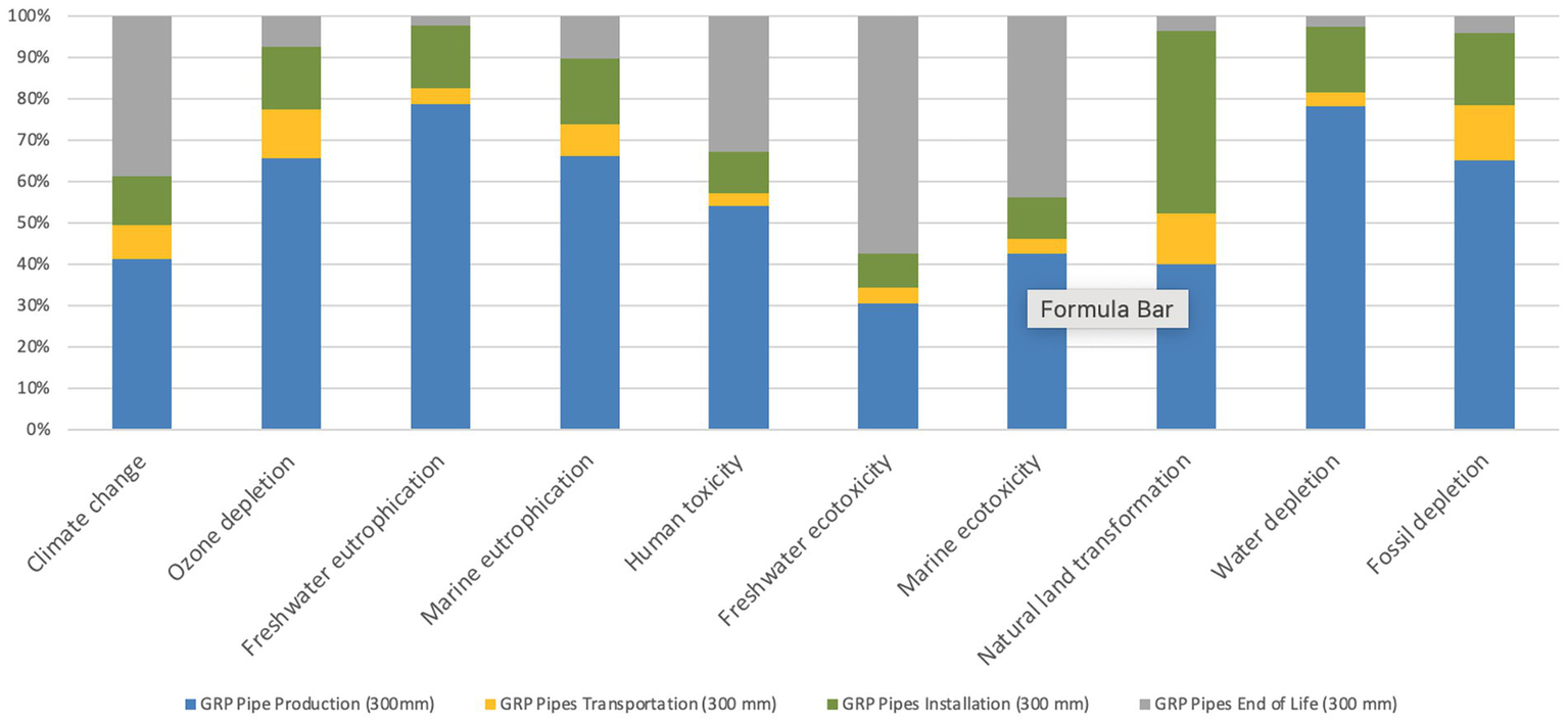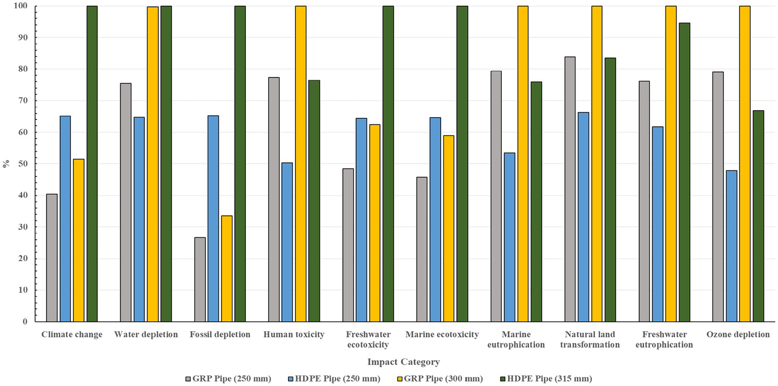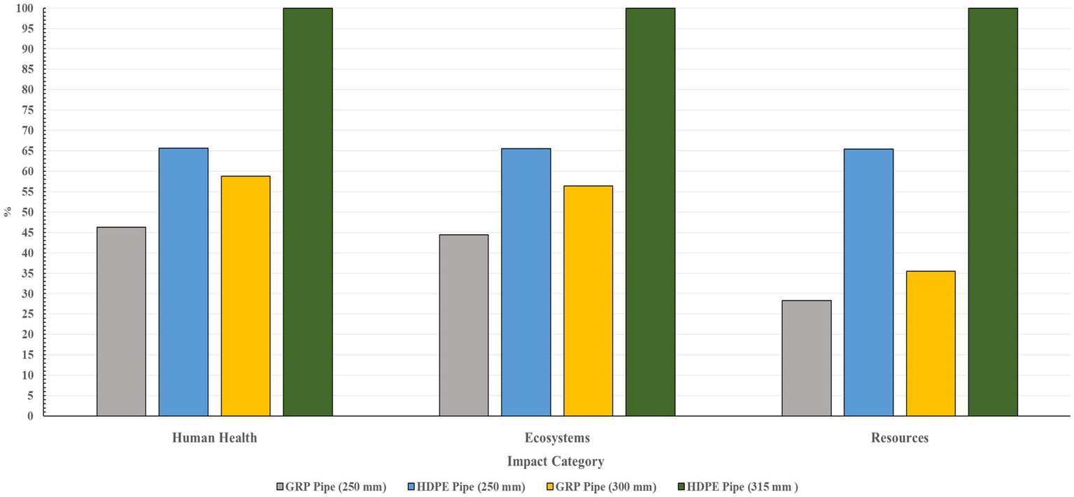 The environmental life cycle impacts of different sizes of GRP and HDPE pipes were analyzed across various impact categories as displayed in Table 4. The categories included climate change, fossil depletion, human toxicity, freshwater eutrophication, marine eutrophication, freshwater ecotoxicity, marine ecotoxicity, water depletion, ozone depletion, and natural land transformation. Additionally, HDPE pipes showed significant impacts in terms of fossil fuel depletion, largely due to their reliance on petroleum-based raw materials, which are energy-intensive to extract and process. In contrast, GRP pipes demonstrated higher impacts in human toxicity, as well as higher impacts on ozone depletion, which can lead to increased UV radiation entering the Earth’s atmosphere. High human toxicity levels mean that these pipes can directly or indirectly damage human health and lead to illnesses such as cancer and respiratory diseases. This is typically a result of high levels of arsenic, sodium dichromate, and hydrogen fluoride being released during the different life cycle stages of the pipes. Both GRP and HDPE pipes contributed significantly to marine eutrophication and water depletion. HDPE pipes dominated in the impact categories of climate change, fossil depletion, freshwater ecotoxicity, and marine ecotoxicity, largely because of the ecotoxic chemicals used during manufacturing and the energy-intensive production processes. GRP pipes showed higher impacts in human toxicity, freshwater eutrophication, natural land transformation, and ozone depletion. Both HDPE and GRP pipes had significant impacts on marine eutrophication and water depletion. When analyzing Table 4, it is important to note that some impact parameters, such as ozone depletion and freshwater eutrophication, may have small values; however, these small amounts can have drastic effects on the environment. For instance, the depletion of the ozone layer can lead to an increase in damaging UV light entering the Earth’s atmosphere, while freshwater eutrophication can damage the quality of water and reduce animal populations.