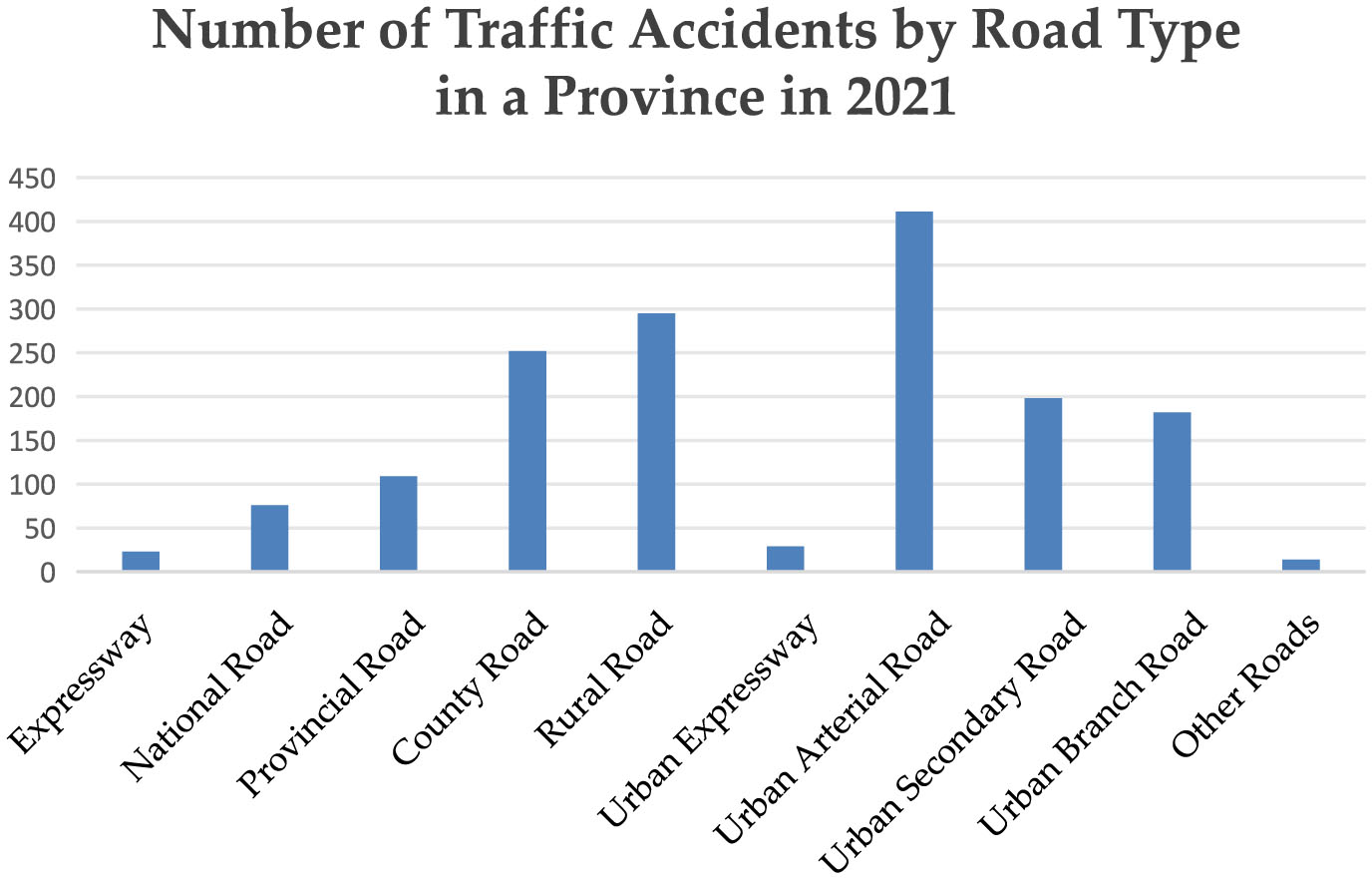 The number of traffic accidents across different road types in a province in 2021.