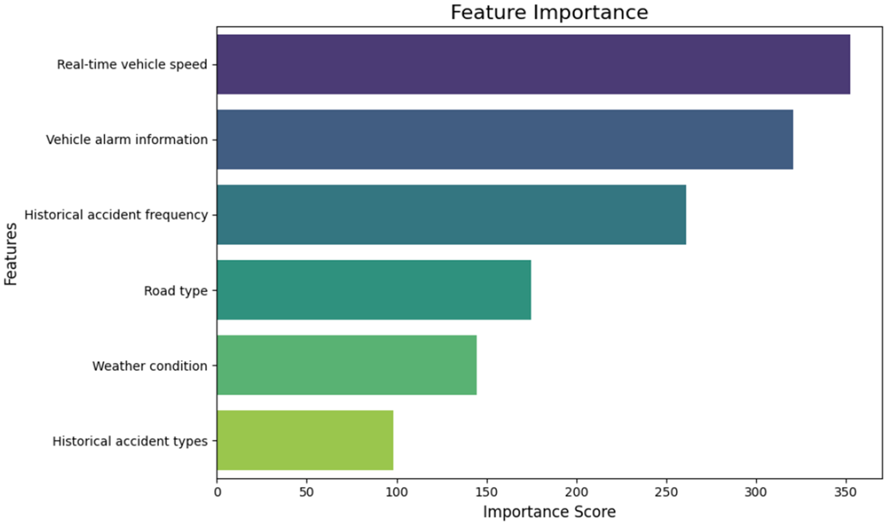As shown in Figure 4, real-time vehicle speed and vehicle alarm information are the most influential predictors, indicating that dynamic driving behavior and real-time vehicle diagnostics play a critical role in accident occurrence. Historical accident frequency ranks next, as it reflects the unresolved high-risk factors in specific temporal and spatial contexts. Road type and weather conditions have a moderate impact, suggesting that the infrastructure and environmental factors can influence accident risk. Due to lacking direct correlation with real-time risk factors , historical accident types have the weakest effect. Above all, these findings help clarify the relative importance of accident-related features and provide a basis for selecting input parameters in accident risk prediction.