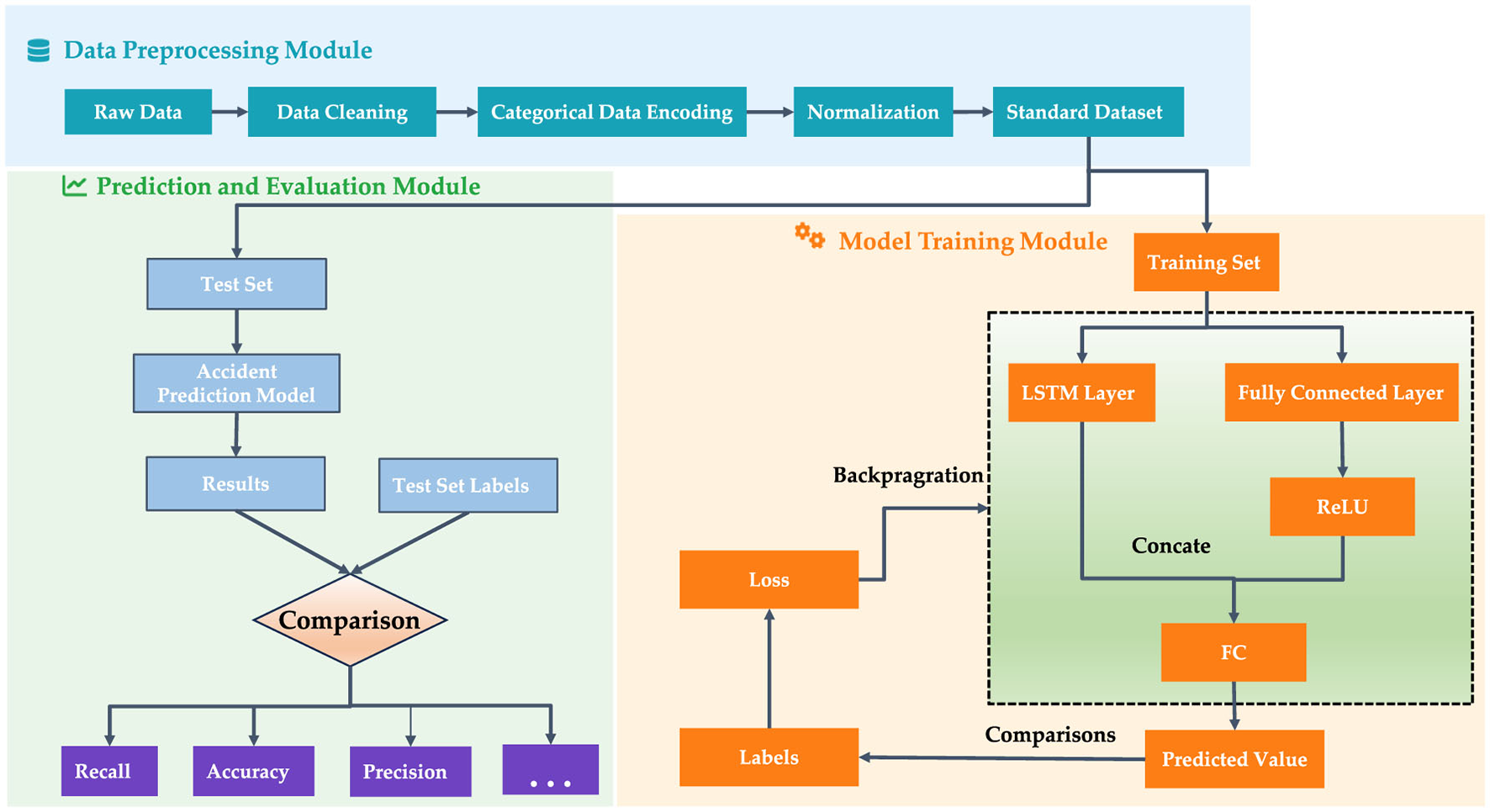 (3) Risk Prediction Module: The risk prediction module inputs the preprocessed test data into the trained accident risk prediction model. The model performance is assessed by comparing the prediction results with the actual outcomes.