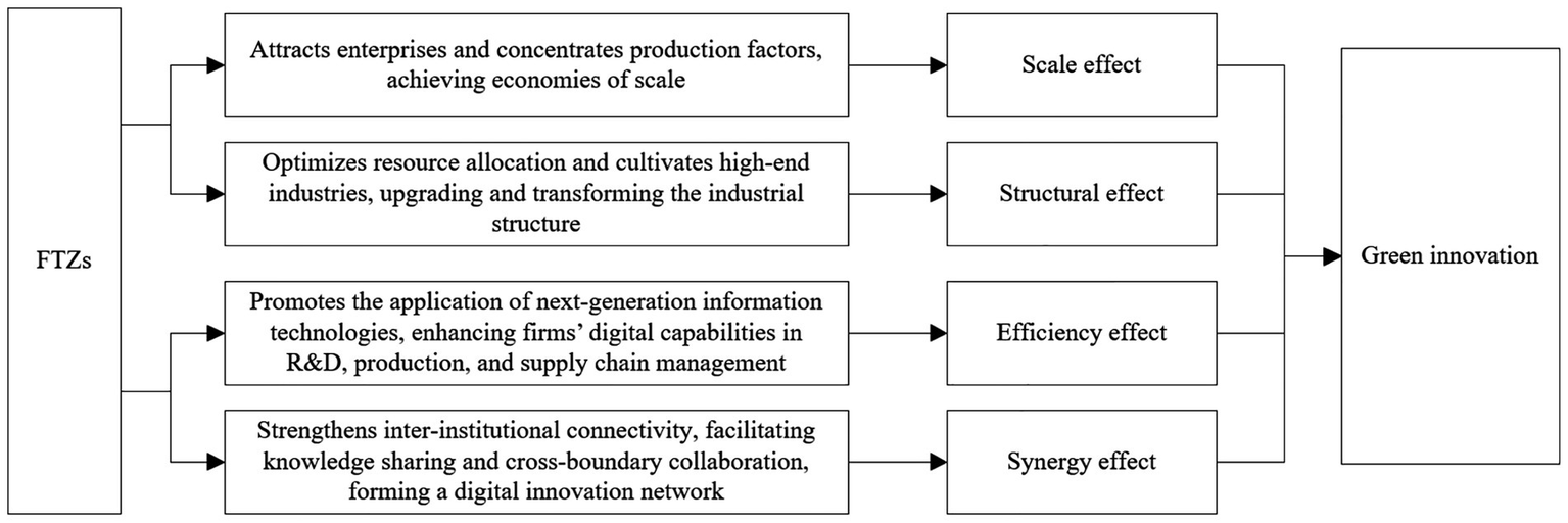 As frontier platforms for institutional innovation, FTZs can promote GTI through industrial agglomeration and the digital economy. The logical framework of this mechanism is illustrated in Figure 1.