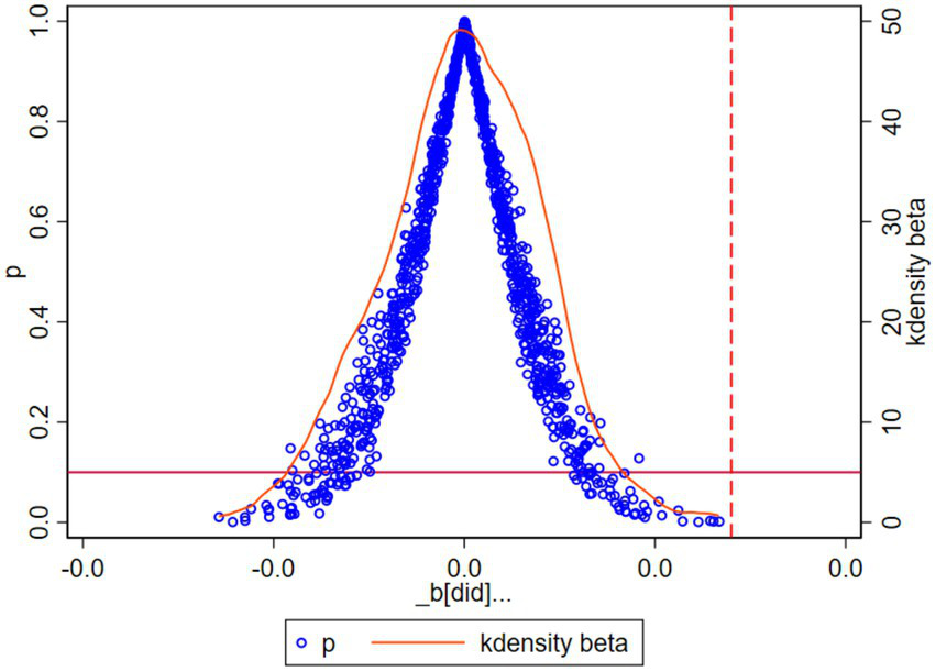 This study first estimates the direct impact of FTZs on regional GTI. The p-value of the Hausman test is 0.000, leading us to reject the null hypothesis. This indicates that individual effects are correlated with the explanatory variables, and thus a fixed effects model is appropriate. Additionally, the regression controls for time and regional effects, with the baseline estimation results shown in Table 2. Column (1) includes only the FTZs dummy variable. Columns (2)–(5) sequentially add control variables for economic development, informatization degree, financial development, and government intervention. The estimated coefficient of FTZs is statistically significant and positive across all columns, indicating that the establishment of FTZs significantly promotes GTI in host cities, confirming Hypothesis H1. According to the coefficient in column (5), the establishment of FTZs is associated with an increase of approximately 696.501 units in the local GTI index, demonstrating that FTZs contribute substantially to enhancing regional GTI.