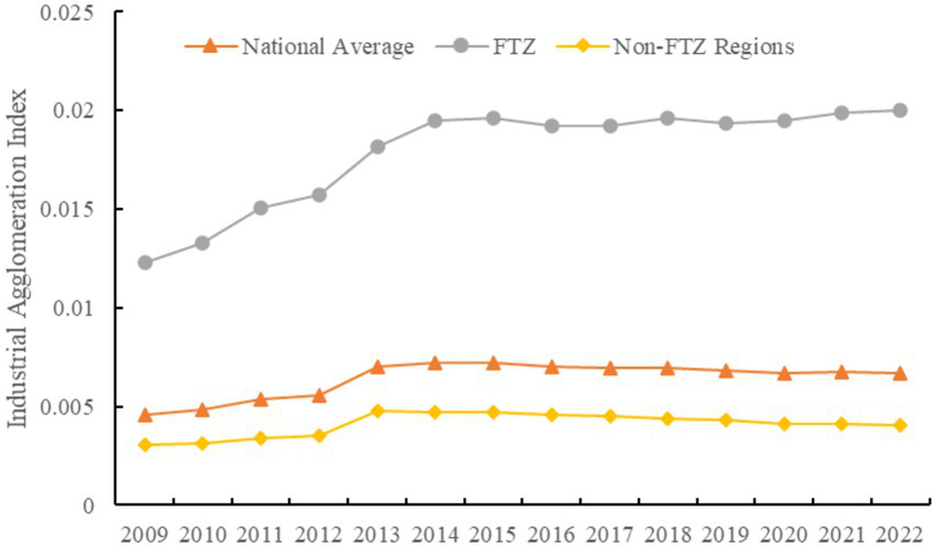 Enhancing green innovation capacity is not only essential for strengthening the competitiveness of FTZs but also a foundation for promoting the green transformation of industries. Under the policy support of FTZs, regional industrial agglomeration has accelerated, leading to enterprise expansion and greater input of production factors, which in turn increases pressures of energy consumption and carbon emissions. Recent studies (Degirmenci et al., 2024; Aydin et al., 2025; Destek et al., 2025) indicate that GTI can reduce carbon emissions by fostering energy-saving and environmentally friendly technologies and clean production processes, and also regulate emissions by improving efficiency and resource utilization, thereby benefiting regions with strong industrial agglomeration. At the same time, Degirmenci et al. (2025) and Chen and Xie (2025) highlight that the digital economy—by optimizing factor allocation, facilitating information flows, and promoting technology diffusion—can reinforce the positive role of industrial agglomeration in advancing green innovation. This enhances regional spillover effects and injects momentum into the high-level openness and industrial upgrading of FTZs.