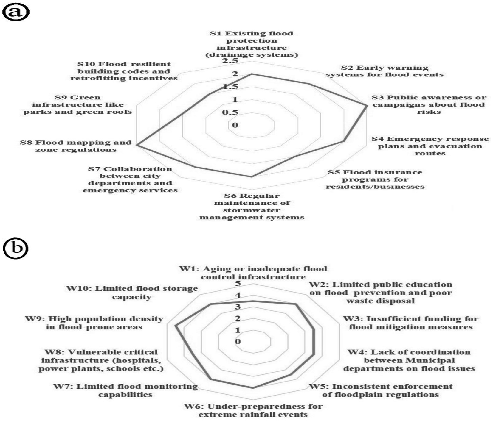 Figure 3a presents the results of internal factors of strengths and weaknesses in the SWOT model. The Perception Strength Index (PSI) obtained a SWV of 8,034 and a mean value () of 1.95. Positive deviations were observed in S3 (public awareness campaigns) and S8 (flood mapping and zoning regulations), with scores above 2.5, which suggests they are perceived as more impactful. Similarly, S1, S2, S4, S6, and S7 had individual scores of 2.0, indicating moderate effectiveness. In addition, S5, S9, and S10 each scored 1.5, which is below the PSI mean, showing their perceived weaker PSI.