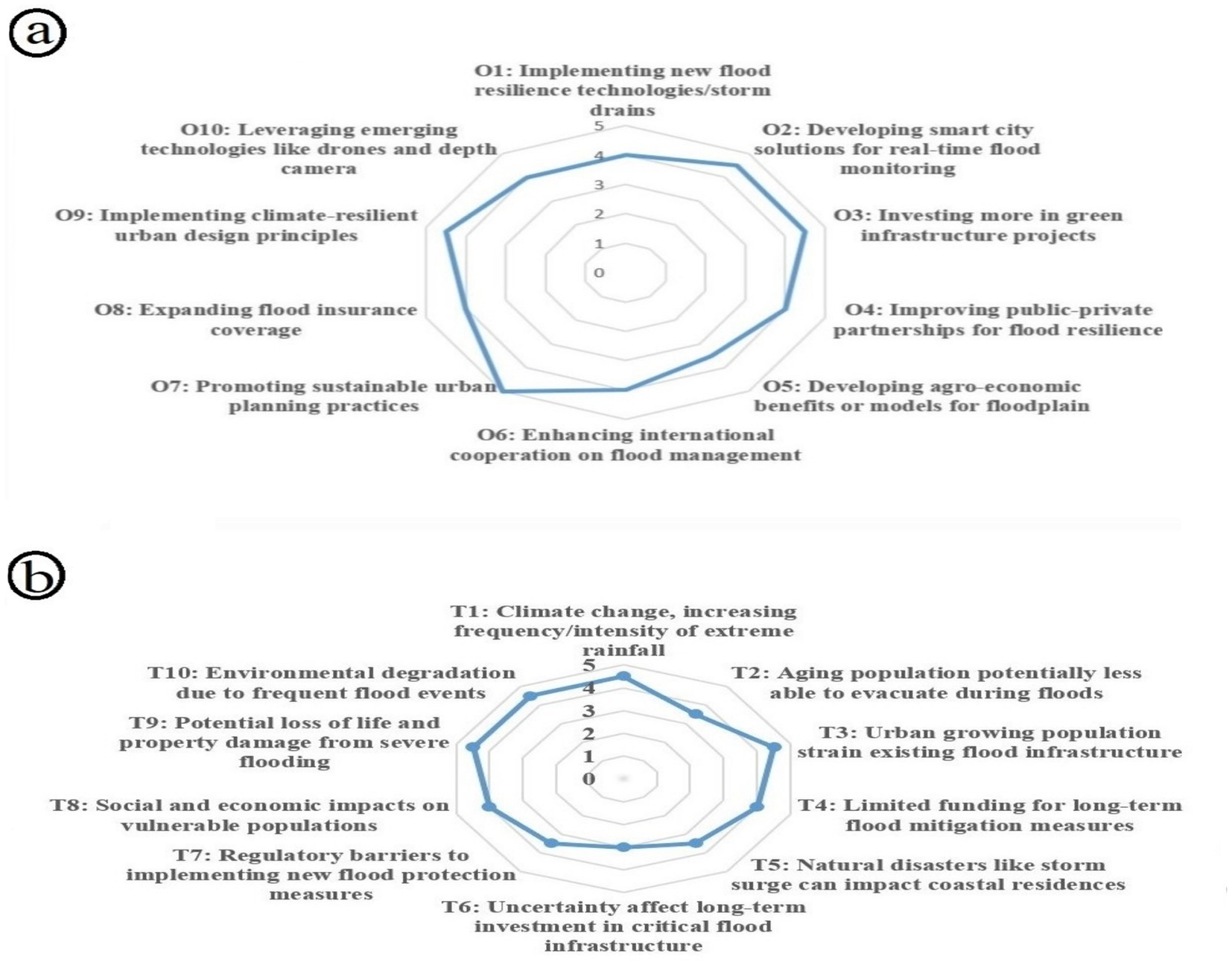 Results in Figure 4a revealed that the Perception Opportunities Index (POI) obtained a POI mean value () of 4.2. Findings show that the topmost opportunity was found in O7 (5.0), while others, such as O2, O3, and O9, had a mean score of 4.5. Moderate opportunities were found in O1, O4, O6, O8, and O10, with a mean score of 4.0, which is considered viable but requires targeted execution. POI obtained the highest SWV of 17,304 with the highest mean score of 4.2 in the SWOT model, establishing a combination of high likelihood, severity, and mitigation of possible impacts of urban flooding through suggested opportunity indices. The high-rated opportunities appear to be proactive, integrated, and formidable strategies for addressing flood challenges and enhancing urban resilience and disaster reduction efforts.