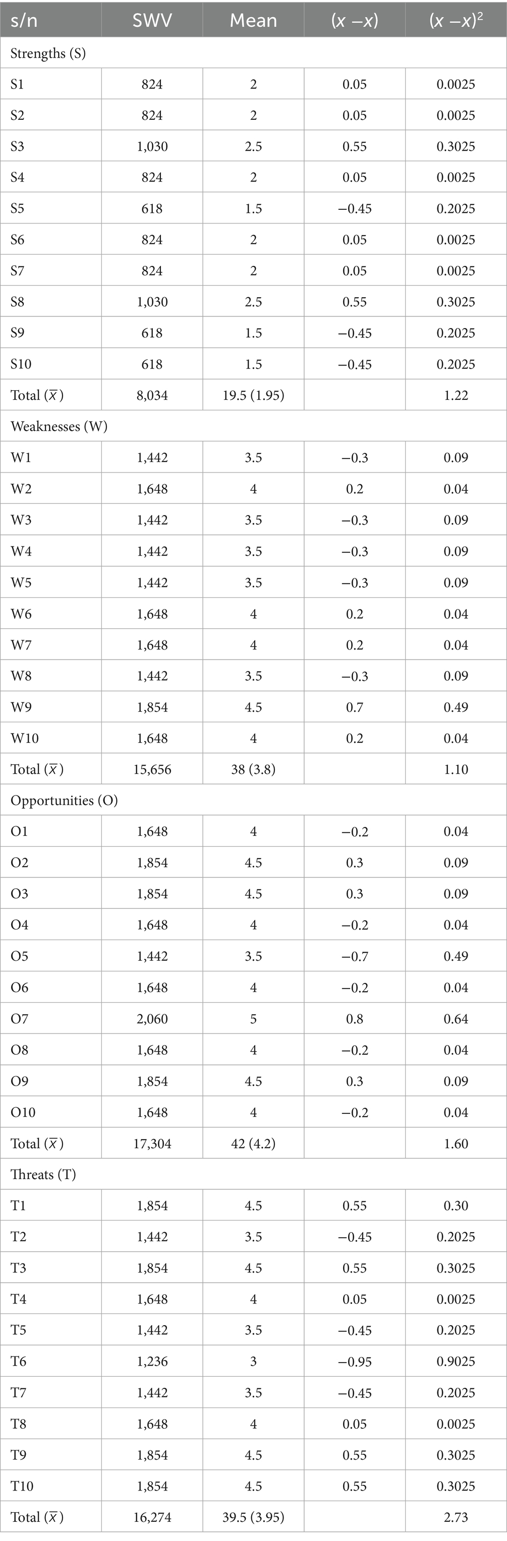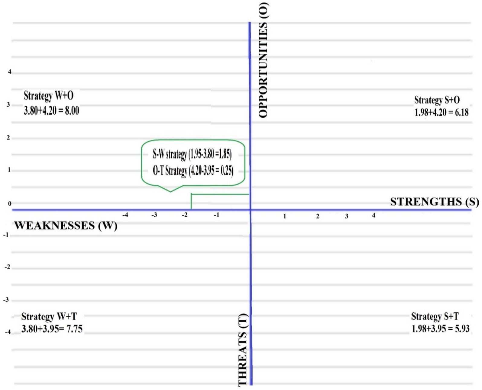 The study utilized AHP, a popular tool for Multi-Criteria Decision-Making (MCDA). Saaty’s (1980) procedures were followed, focusing on the most important alternative, and the preference for all alternatives for each decision-making. The study utilized mean values of SWOT matrix (Nathaniel et al., 2023). The internal factors strategy (IFAS) focused on strengths and weaknesses, while the external factors strategy (EFAS) considered the opportunities and threats.