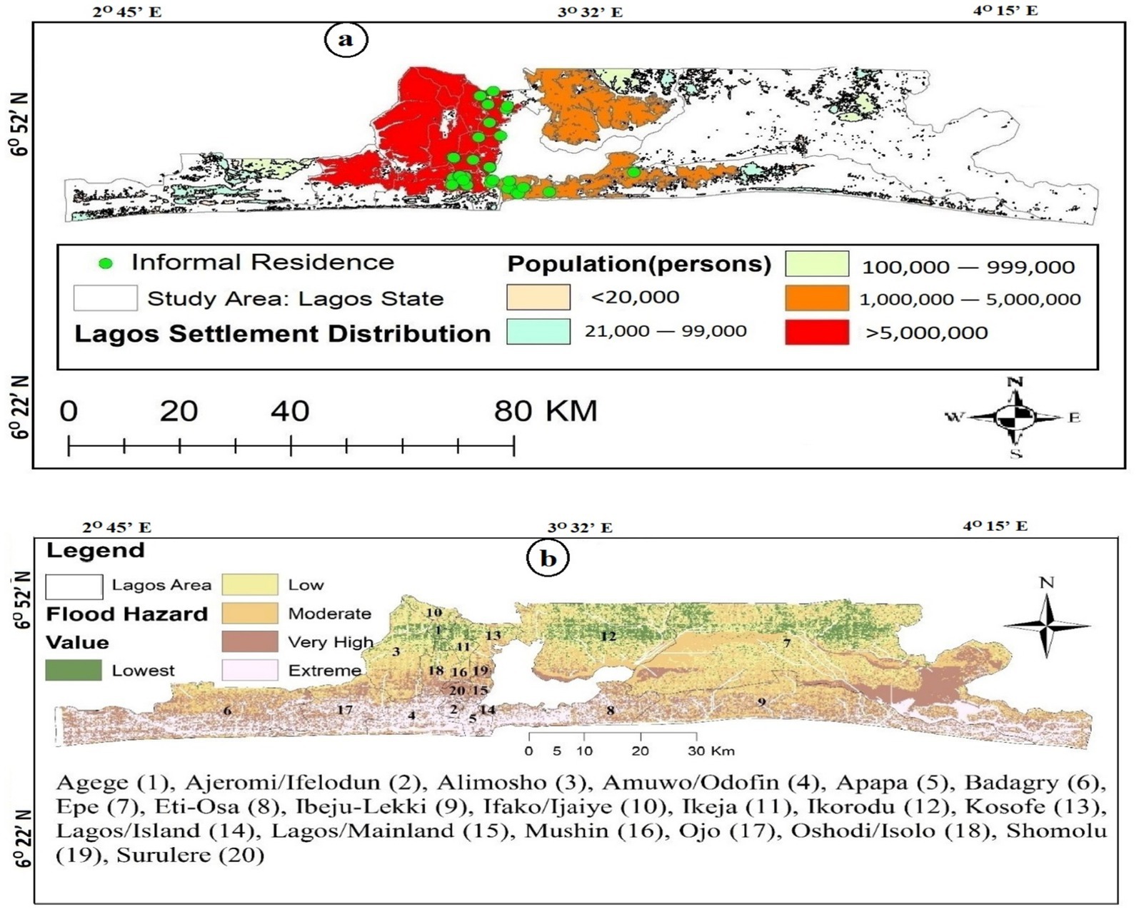 Figure 6. (a) Flood hazard mapping of the 20 LGAs of Lagos State. (b) Population density with their vulnerability to flood.