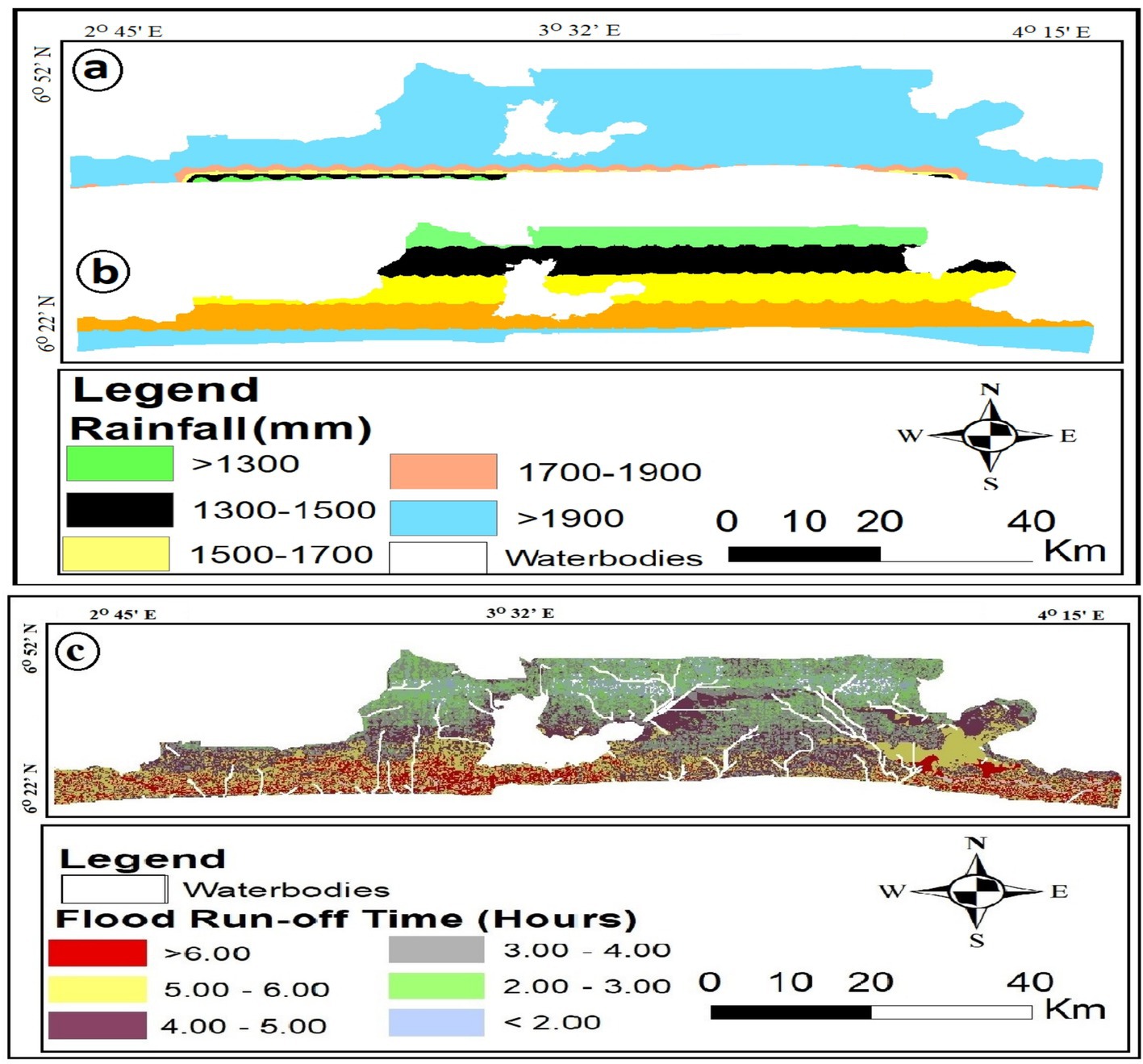 Figure 7c represents flood run-off time and response of shorter run-off time (2–3 h) observed in the northern region of the study area, as flooding occurs and recedes normally after the rainfall period. Moderate run-off time (4–5 h) offers more lead time for evacuation or intervention, but the rainfall may result in prolonged flooding due to slow water dissipation. The high-risk areas are mainly in the southern belt of Lagos State, dominated by a longer run-off time (6 h), which indicates high vulnerability due to slow drainage and accumulation of water. The JJA and SON rain periods necessitate early warning to residents of flood-prone areas in the Lagos metropolis. Similarly, findings emphasize the prolonged surface inundations of 6 h in coastal areas, resulting in significant losses across the rainfall peak season. Flood resilience efforts by appropriate municipal authorities should focus on depopulating coastal residences, channelizing waterways, and relocating vulnerable populations to a safe resettlement base.