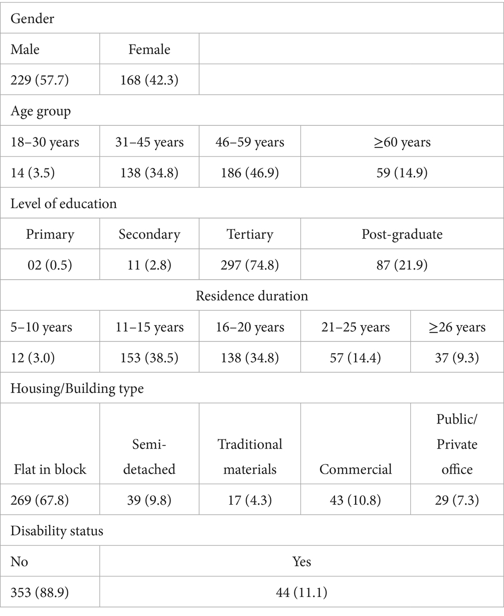 Most respondents (67.8%) resided in flats in blocks, and the others lived in semidetached houses (9.8%), houses made of traditional materials (4.3%), commercial buildings (10.8%), and office buildings (7.3%). The age of the buildings was distributed as follows: less than 5 years (1.0%), 5 to 10 years (19.4%), 11 to 20 years (28%), 21 to 30 years (34%), and 31 years and above (17.6%). When considering disability status, the majority (88.9%) had no disability while 11.1% reported various levels of disability. Respondents demonstrated good knowledge of urban flooding, providing valuable responses on flood impacts, mitigating measures, and intervention schemes. The significant sociodemographic attributes indicated that the majority of respondents were mature, adult, well-educated men.