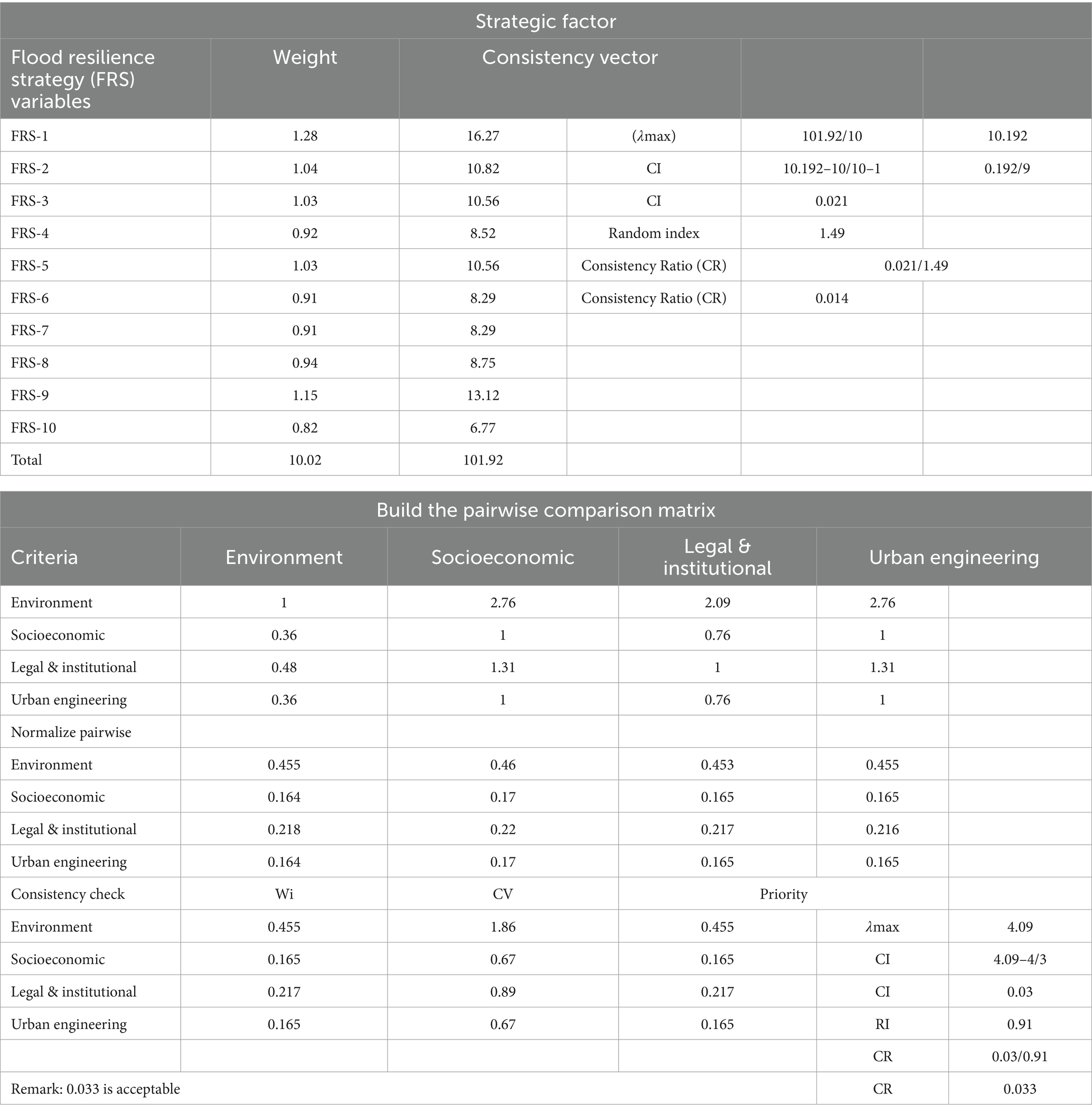 The study validated the accuracy of calculated weight values using a consistency ratio (CR). AHP principles of quantitative weights using pairwise comparisons helped in ranking flood resilience options, rendering decision-making more transparent and systematic (Saaty and Vargas, 2001). However, major AHP studies require random index (RI) values, as adopted from Saaty (1980), and the CR threshold of 0.10, as suggested by Saaty (1990), was used to determine the acceptability of the pairwise comparison matrices. Therefore, the eigenvector value was obtained by multiplying the comparison matrix by the weight of each element as represented in the formula expressed in Equation 4: