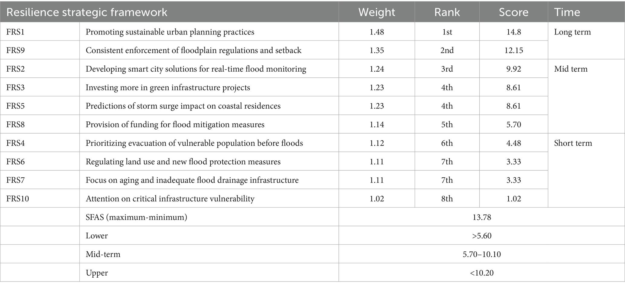 The AHP model ranking was used to establish the strategy timeframe with formulated strategic frameworks. The timeframe was categorized into three phases: short-term, mid-term, and long-term plans. The aggregate weight score of all variables was calculated to determine the strategic timeframe for each variable. The SFA summary within the lower category indicated short-term plans, while mid and upper values defined mid-term and long-term plans, respectively. However, the short-term plans (<5.61) included RS10, attention on critical infrastructure vulnerability (1.02); RS7, focus on aging or inadequate flood drainage infrastructure (3.33); RS6, regulating land use and new flood protection measures (3.33); and RS4, prioritizing evacuation of vulnerable populations before floods (4.48). Mid-term plans ranged from 5.7–10.1, including RS8, provision of funding for flood mitigation measures (5.7); RS5, prediction of storm surge impact on coastal residences (8.61); S3, investing more in green infrastructure projects (8.61); and RS2, developing smart city solutions for real-time flood monitoring (9.92). In addition, the long-term plan (>10.2) consisted of RS9, which includes consistent enforcement of floodplain regulations and setback (12.15), and S1, which includes promotion of sustainable urban planning practices (14.8).