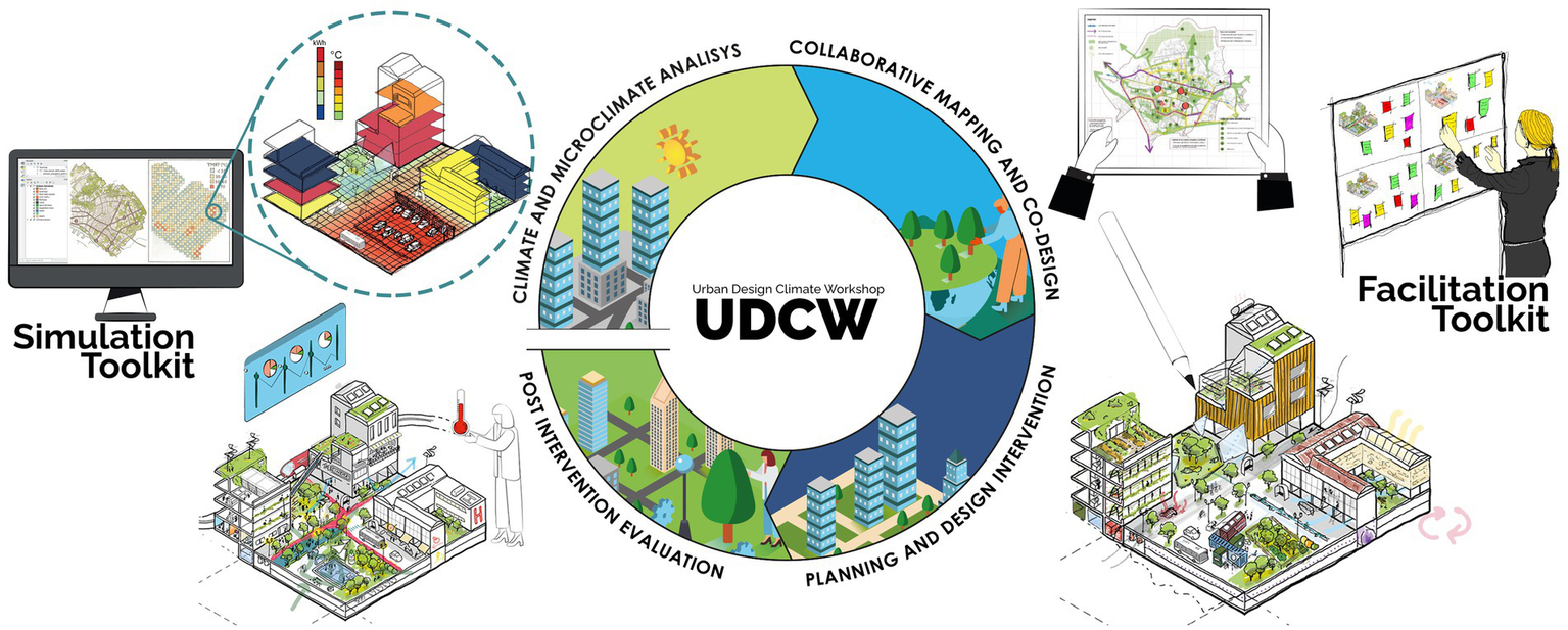 The Urban Design Climate Workshop (UDCW) represents a key methodological response to these challenges. Conceived as an applied, capacity-building process, the UDCW brings together urban designers, climate scientists, planners, policymakers, students, and local stakeholders in a collaborative environment to co-develop transformative climate actions for specific urban districts. Through scenario modelling, participants and experts assess projected climate impacts across different development, zoning and land use alternatives, while community-based climate-sensitive prototyping helps identify spatial strategies that integrate both mitigation, adaptation and livability objectives.
