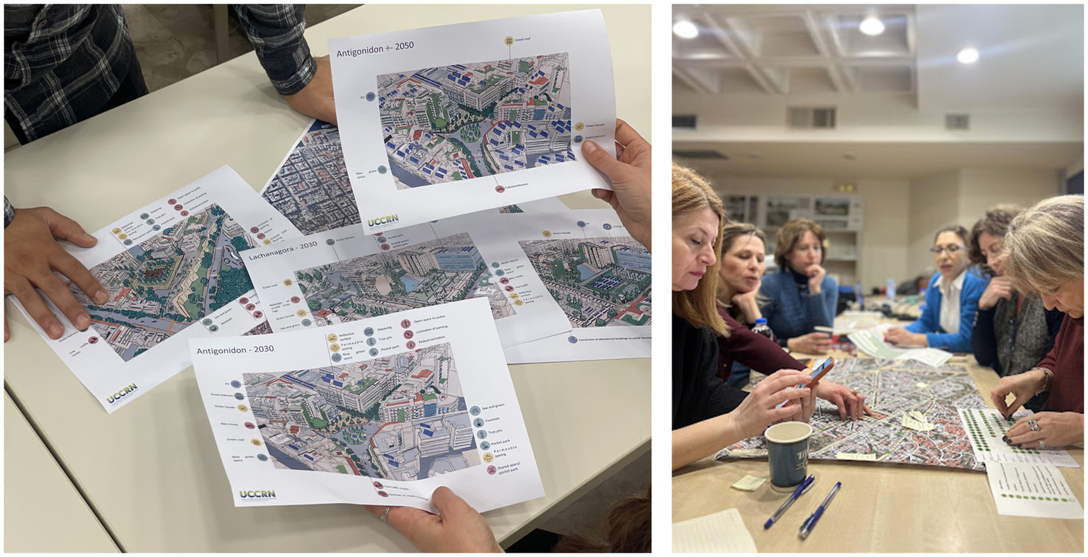 Together, these tools are deployed within participatory workshops to facilitate structured interactions among institutions, experts, and communities, guiding the co-design of urban transformation pathways for mutual learning (Calvo et al., 2022) and co-production of knowledge (Visconti, 2023). In synergy with the UDCW Simulation Toolkit, the facilitation tools enrich quantitative analyses with stakeholder-derived knowledge, thereby contributing to integrated climate risk assessment, performance evaluation, and the development of socially grounded, climate-responsive design strategies. UDCW Facilitation toolkit contribute in conducting workshops activities in which local authorities, stakeholders, students, practitioners and community are engaged to collaboratively envision city transformation pathways, to identify common goals and divergence elements, to evaluate climate benefits and social, economic, and environmental co-benefits of possible technical solutions (Figure 3). The UDCW Facilitation Toolkit is conceived as a flexible instrument, designed to be adapted to various UDCW formats, target audiences, and the specific objectives of engagement activities (Raven et al., 2025a). Its participatory and co-productive dimensions have been progressively refined through action-research practices, incorporating a diverse set of supporting methods to facilitate engagement in the early phases of the UDCW methodology. These include actor mapping, stakeholder priority mapping, climate and neighborhood walks, interviews, and fieldwork activities. The evolution and structuring of the toolkit have also been guided by the intention to explicitly address dimensions of climate justice, as demonstrated through its application in two pilot cases presented in this study—Thessaloniki and Naples (Goncalves et al., 2025; Visconti, 2025).
