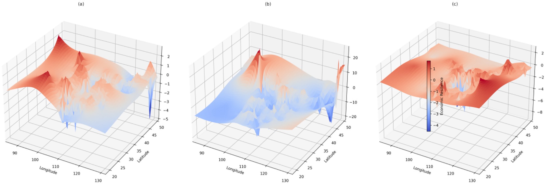 During the study period, China’s regional economic resilience shows significant spatial differences, with many “peak” and “valley” centers forming a multi-core cluster spatial distribution pattern (Figure 3). The XY axis represents longitude and latitude, and the Z axis represents economic resilience. It can be seen from Figure 3 that the resilience index shows obvious volatility in the three stages. In the first stage (2010–2012), economic resilience shows an obvious “ladder” form, with high-value areas concentrated in the western region and low-value areas concentrated in the northeast and southern regions. In the second stage (2013–2018), the overall economic resilience shows an obvious “peak-like” shape, and the regions with high economic resilience are concentrated in the northwest and northeast, while other regions show low economic resilience. In the third stage (2019–2020), economic resilience shows a relatively obvious “N-shaped” form. The economic resilience of all cities has significantly improved, and the low-value regions are concentrated in the central region.